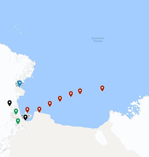 Using the satellite phone, I was able to extract our current latitudinal and longitudinal coordinates from its utility menu (that translates to using X-Plane’s data output to display such info). Using the sat phone’s browser, I input the coords into Google Maps. Did that every 15 minutes or so and, voilà, instant positional reports (denoted by the red pins below)…