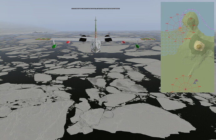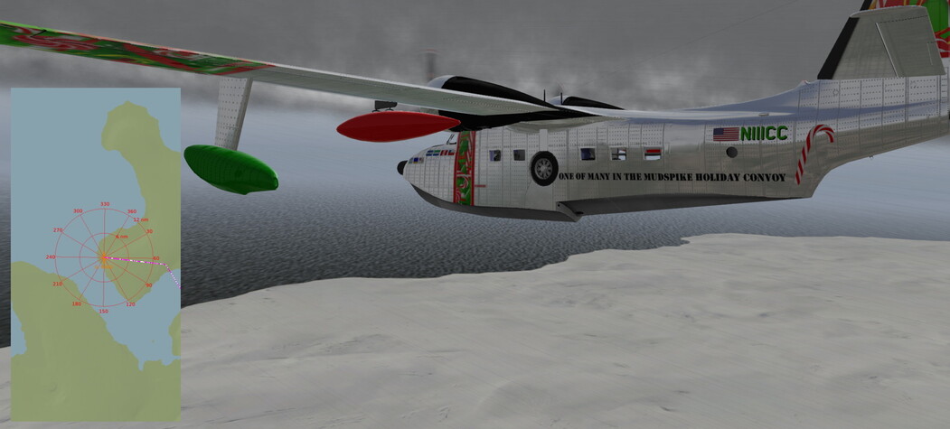 Fuel o’ fuel, we could not get our fattened Albatross back off the water in the real-weather conditions. But another miraculous moment of CAVOK enabled us to do it. Just how many Christmas miracles we have been allotted on this adventure remains to be seen. In the meantime, we flew in a direction what we hoped was West. We kept adjusting our heading to maintain that general direction based on X-Plane’s local map display. Remember (or let me tell you) that the Albatross is not equipped with a GPS, so we were really going on rough estimates.