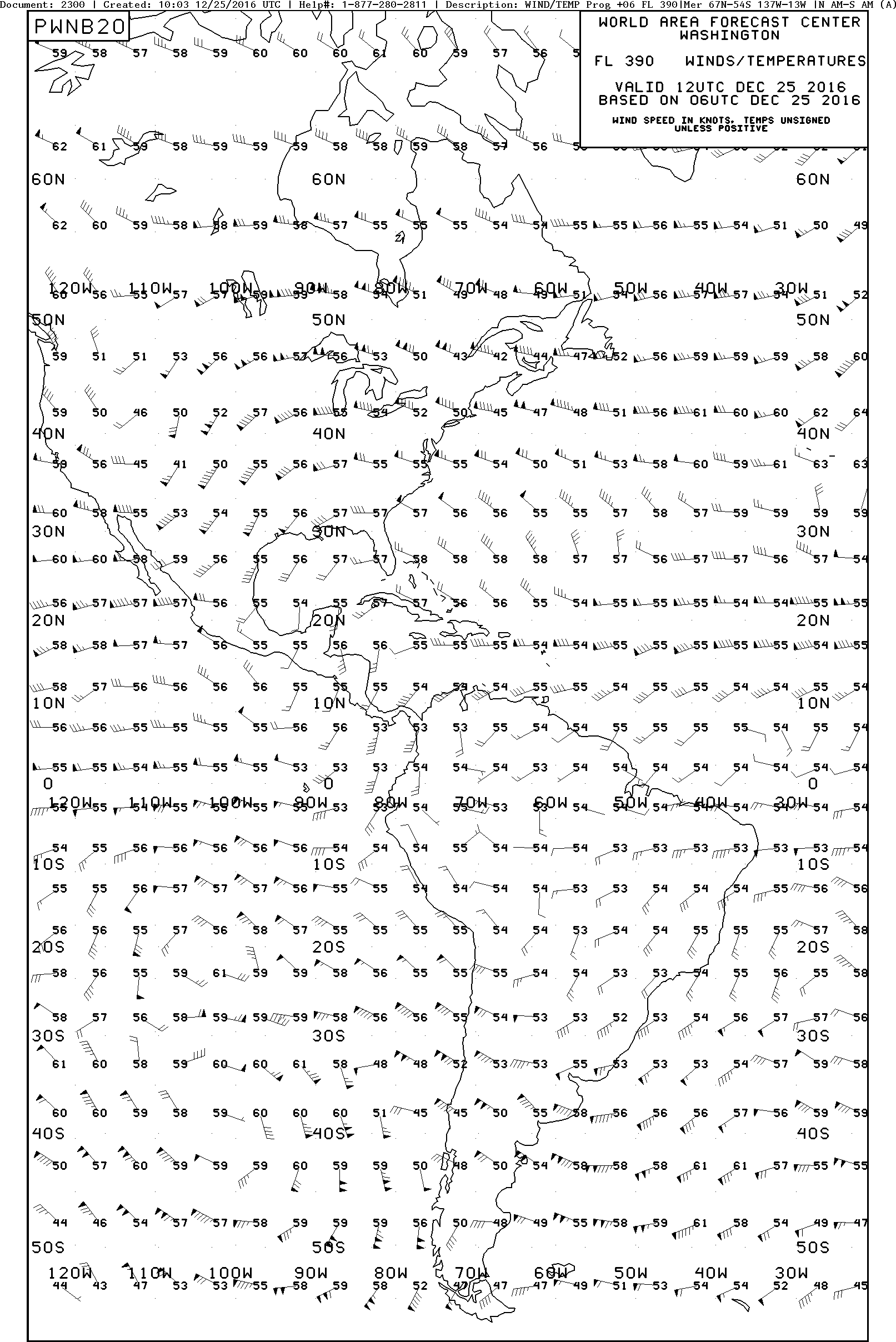 The FL390 winds forecast show we’ll be facing a quartering headwind most of the way, shifting to a direct crosswind averaging about 50 knots…