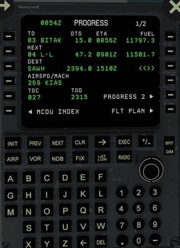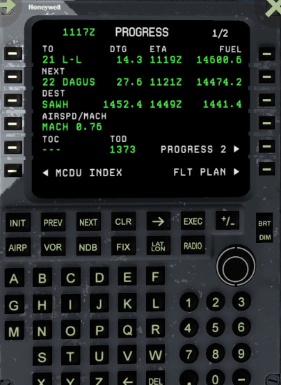 Our FMS shows our ETA and fuel remaining at each intermediate waypoint. Unfortunately, the chevrons listed for SAWH are showing we don’t have enough fuel to make it at this point of the flight…