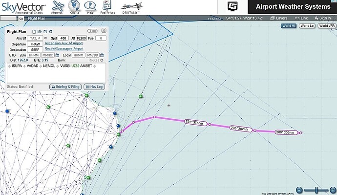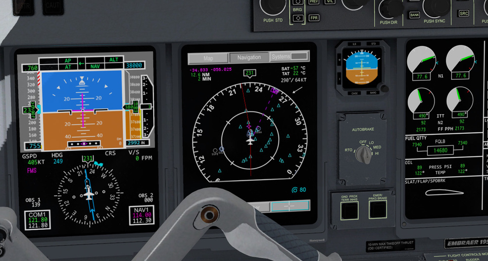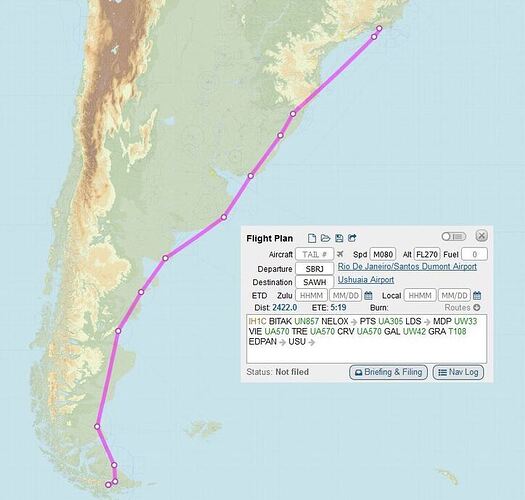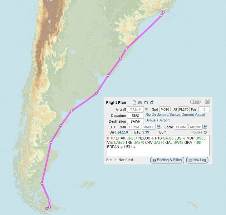 The E195, according to Embraer, has a maximum range of 2,300 nm - although that is the (AR - Advanced Range) version of the 195 (I’m not sure that the X-Crafts E195 is modeling that). Whatever the case, my flightplan is indicating around 2,422 nm from Rio (SBRJ) to Ushuaia (SAWH). Since we aren’t carrying passengers on this demo flight, I’m hopeful we can stretch the range to make it to our destination.