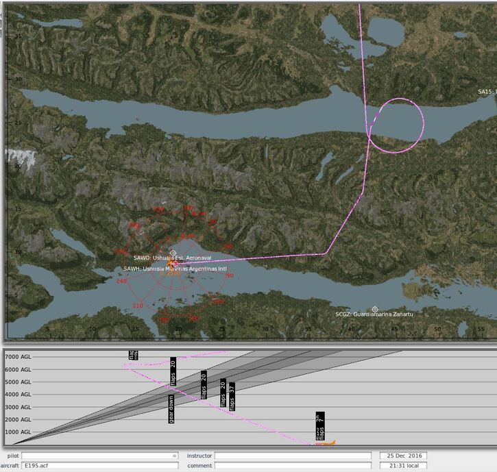 I love the pop-out 2D panels on the X-Craft airplanes. Here we are passing over Rio Grande (SAWE) and getting ready to turn toward the final transition to intercept the ILS to runway 25 at Ushuaia…