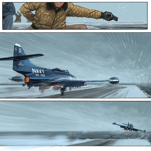 Lt. Robin “Rob” Clower (known from ANGEL WINGS volumes 1 - 5), this time in a Grumman F9F-2 Panther; © Romain Hugault, Spring 2021