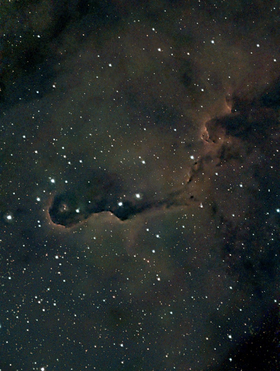 I took the Elephant Trunk image into PixInsight where I processed it quite agressively. I had to crop out a lot of the edges due to ‘field rotation’ issues that occur when you do astro-imaging on an Alt/Az mount. I rotated it to roughly align with my recent Elephant Trunk image (posted further up this thread)…