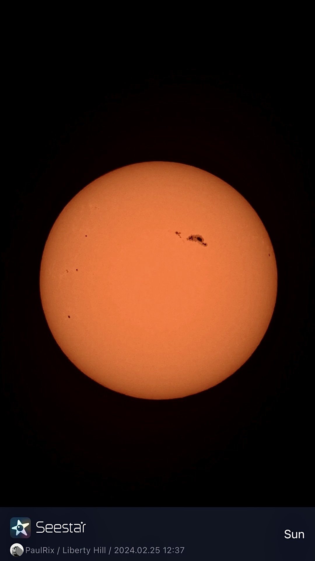 I haven’t had much chance to get out under the stars this past month. Today I took my Seestar outside to take a look at the Sun. I heard that there was a very large sunspot that is visible right now… and indeed there is: