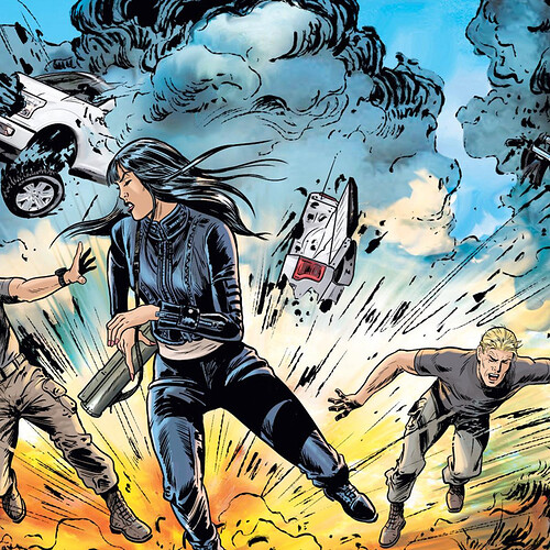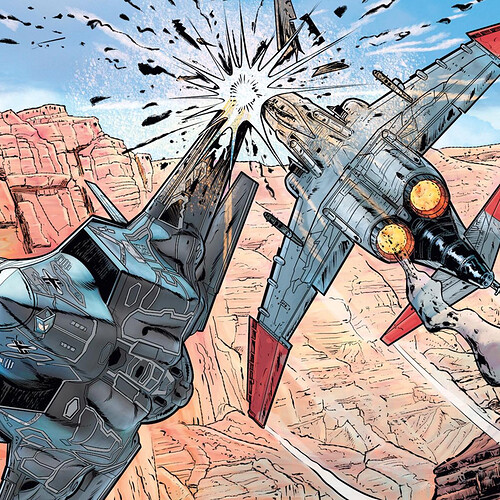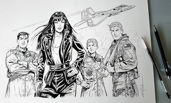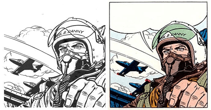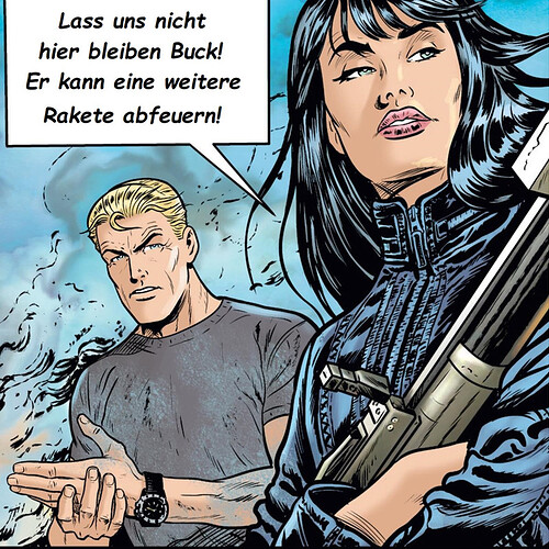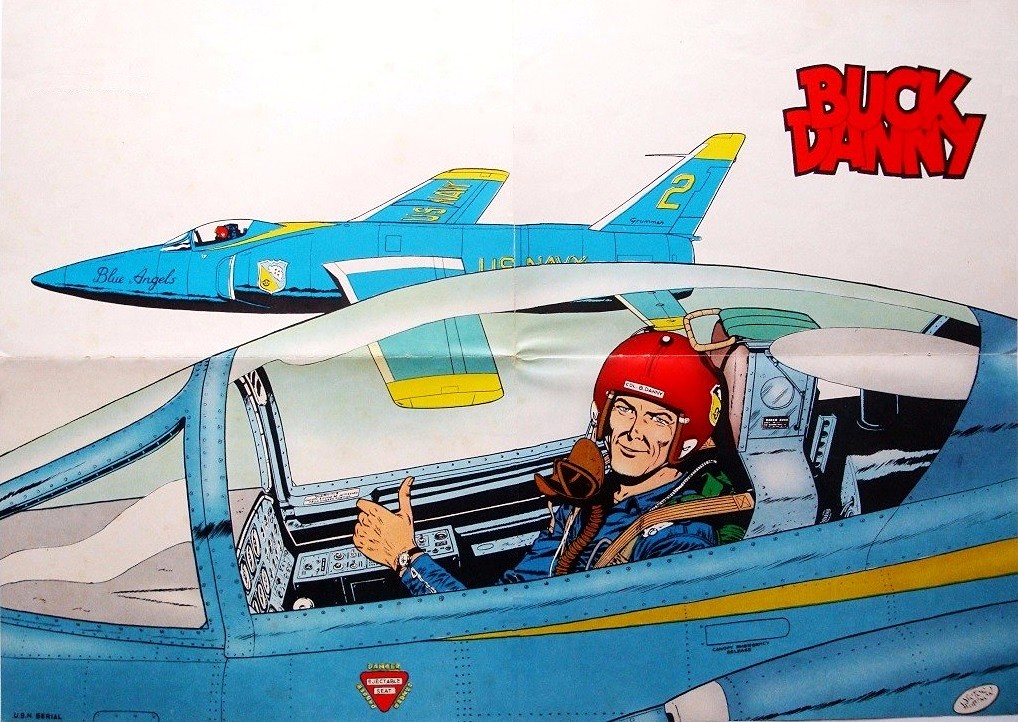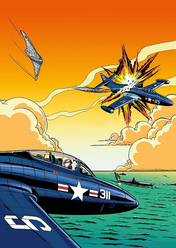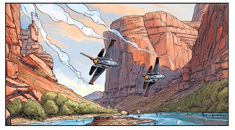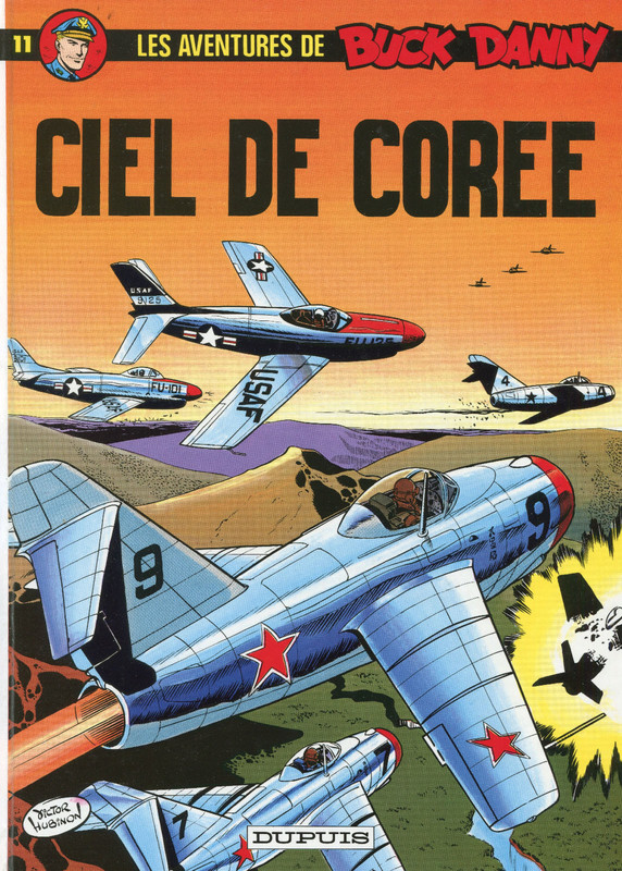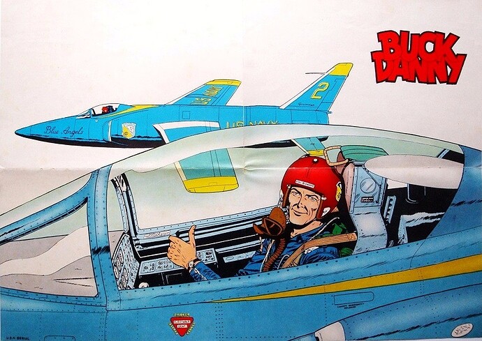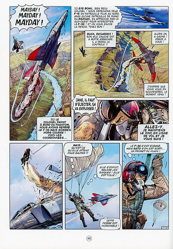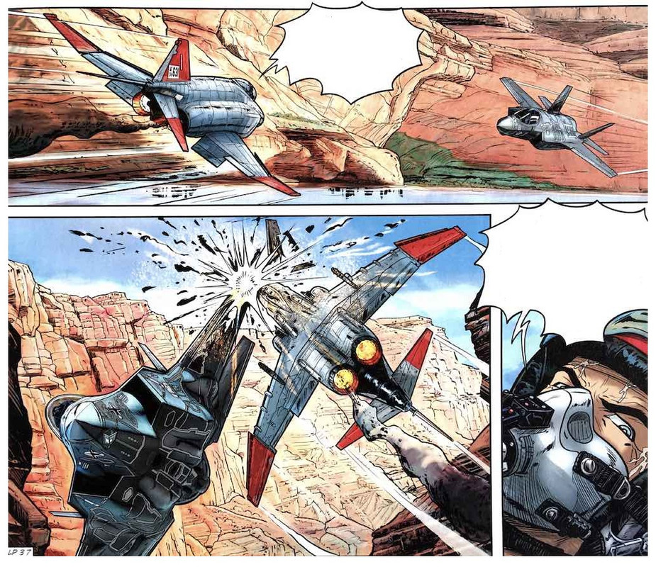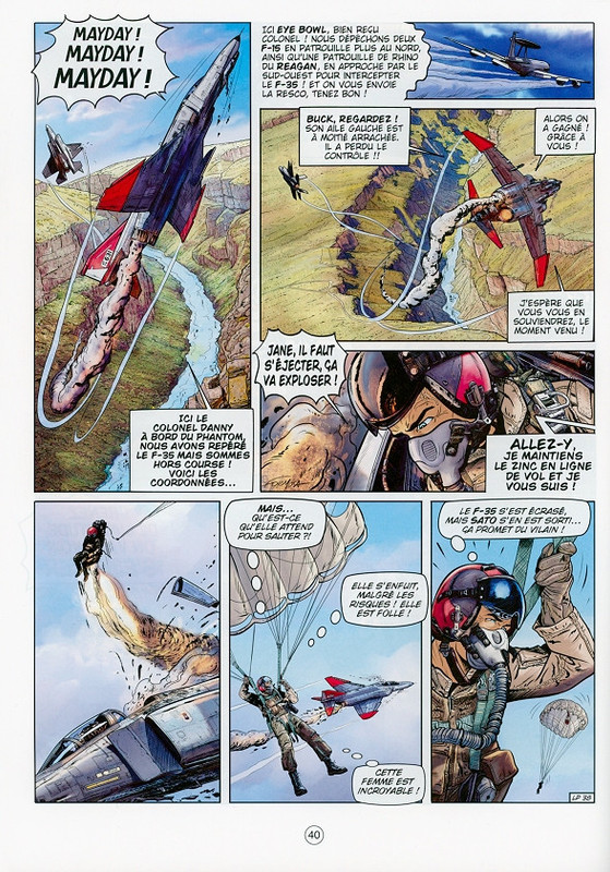 The secret organisation CIRCLE (like SPECTRE in the James Bond movies) is dissatisfied about Jane “Lady-X” Hamilton and send Sato Yamasaki (known from Buck Danny # 54 and #55 [= Cinebook #9 + #10] ) to kill her. Despite prominent with a Colt Python357 Magnum on the album cover, Buck couldn’t kill Sato with this weapon, so Sato may return in the upcoming dyptich. Somewhat earlier, Jane Hamilton, who want’s to survive Sato, was seeking for help with her enemy, Buck Danny, resulting in a pact. She has important info about that deadly virus (read both previous albums), and uses that as an asset. Near the Mexican/American boarder Sato attacks with his (stolen) F-35B the F-4 Phantom-II from Lady-X and Buck Danny. Buck is able to leave the F-4 by parachute, but Lady-X tries to escape to Mexico. However, when she leaves the F-4 by parachute, she just lands on American soil. And because of the (Donald) Trump wall, she isn’t able to escape to Mexico and arrested by the American boarder cops.