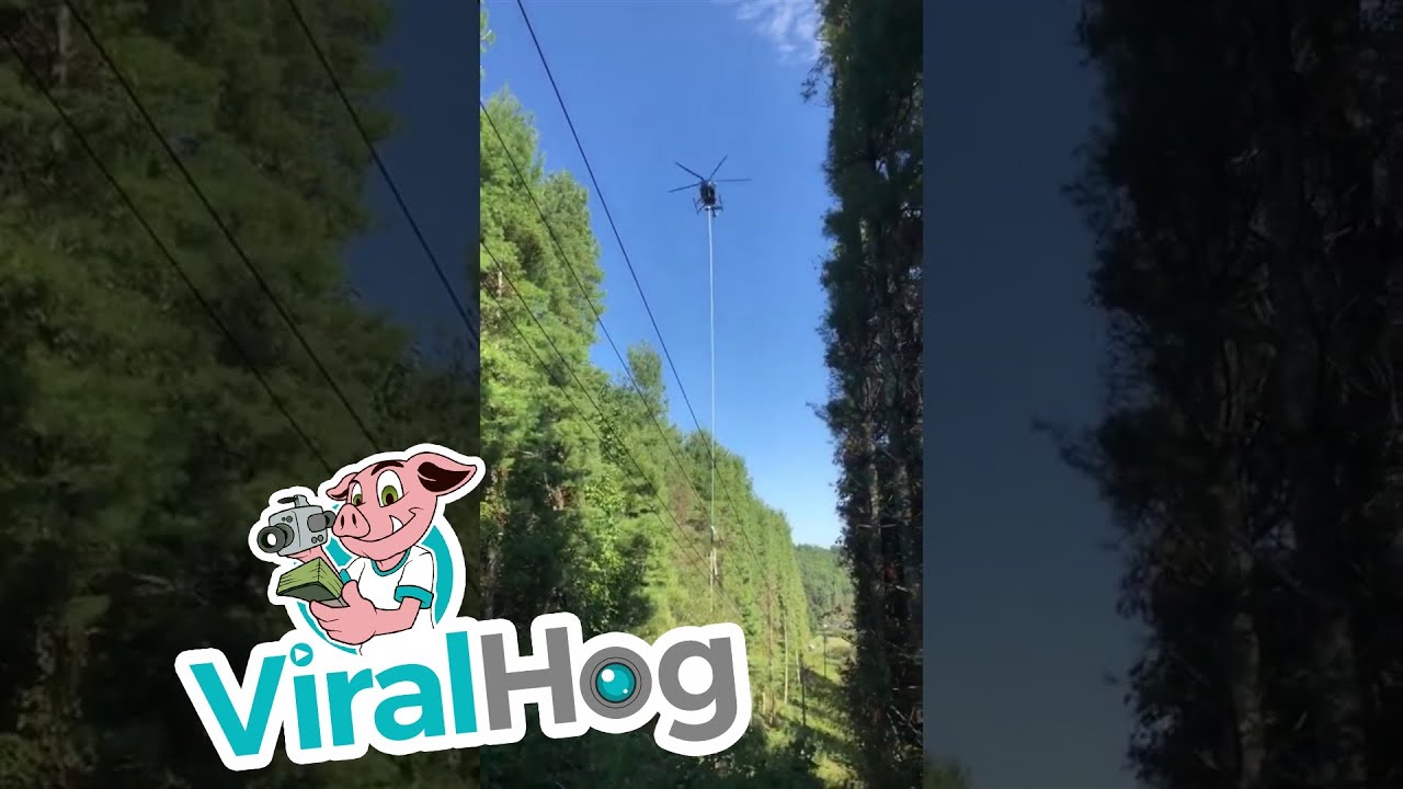 A giant swinging 30ft long chainsaw hanging from an helicopter.