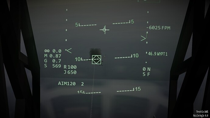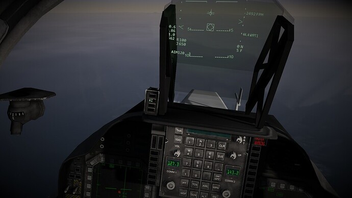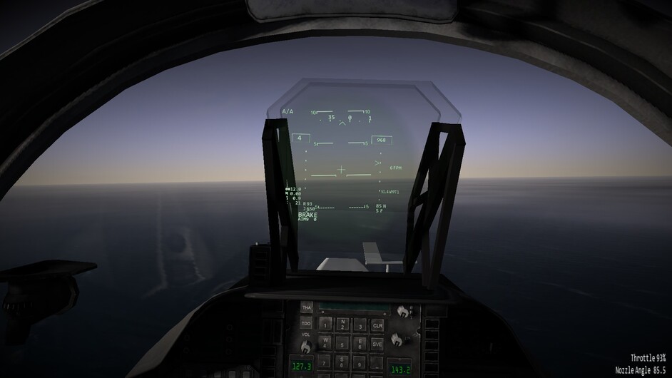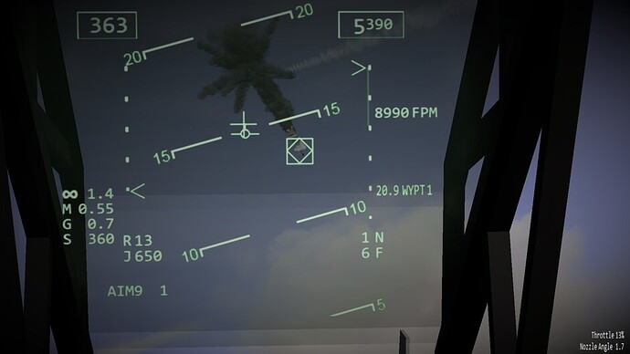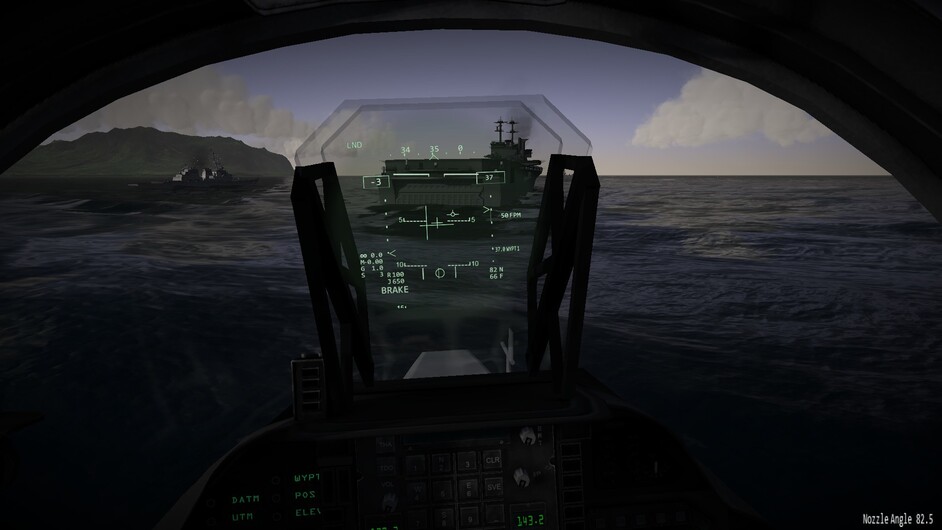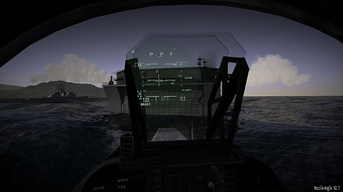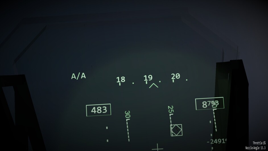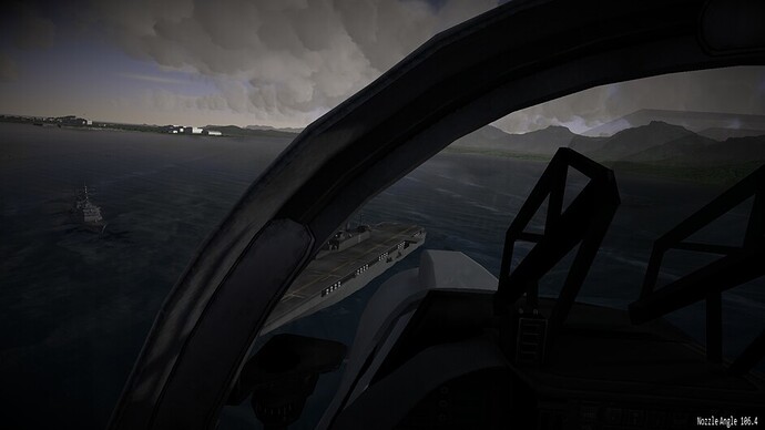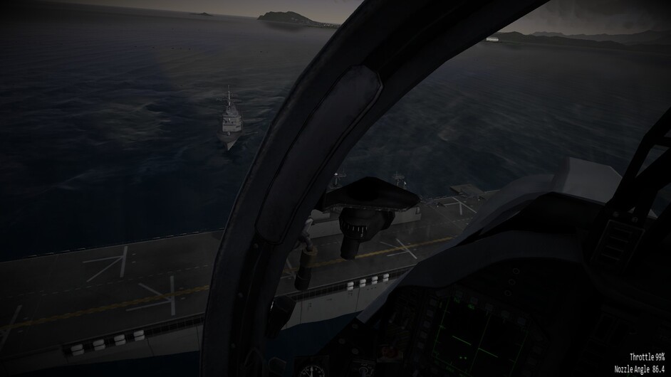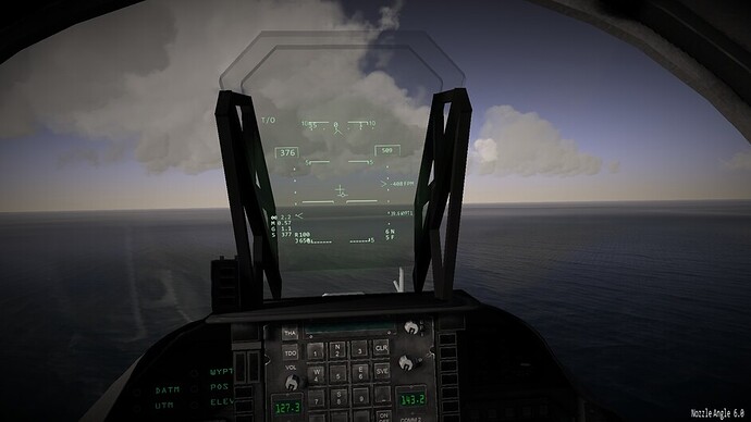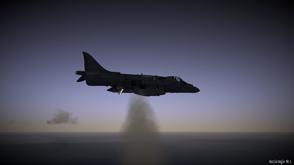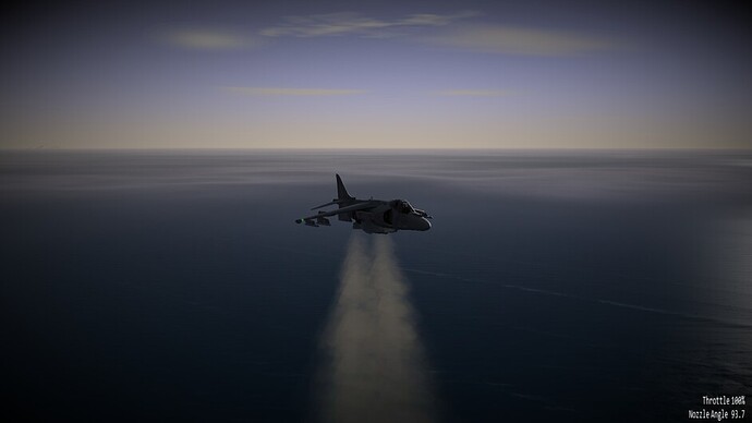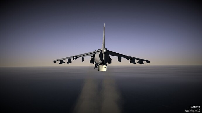 Before we go any further. I’d like to note that there are 3 difficulty levels for hovering. At the easy and medium difficulty levels the throttle becomes a request for vertical velocity. Allowing you to control the rate of climb or descent, or sustain a certain altitude. You can use the stick to control your movements in the remaining two axis. In the most difficult mode, the nozzles become just a vector of force. If you pitch 10 degrees forward while the nozzles are pointing straight down, compared to the harrier, then you will start inducing forward motion as well. You may also see an increased rate of descent as not all force is directed downwards too now. This is the most realistic mode, and the mode I’ve been flying in exclusively so far.