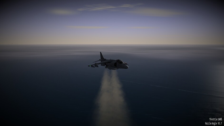 At this point I figured much of the extreme flight model regimes are probably still work in progress. I decided to stop trying to test these things untill the developers had more time to work on things. Instead I decided to take-off one more time. Burn of some fuel and fire off my missiles at unsuspecting fishes in order to test what sets the Harrier apart from 99.5% of the other warplanes.