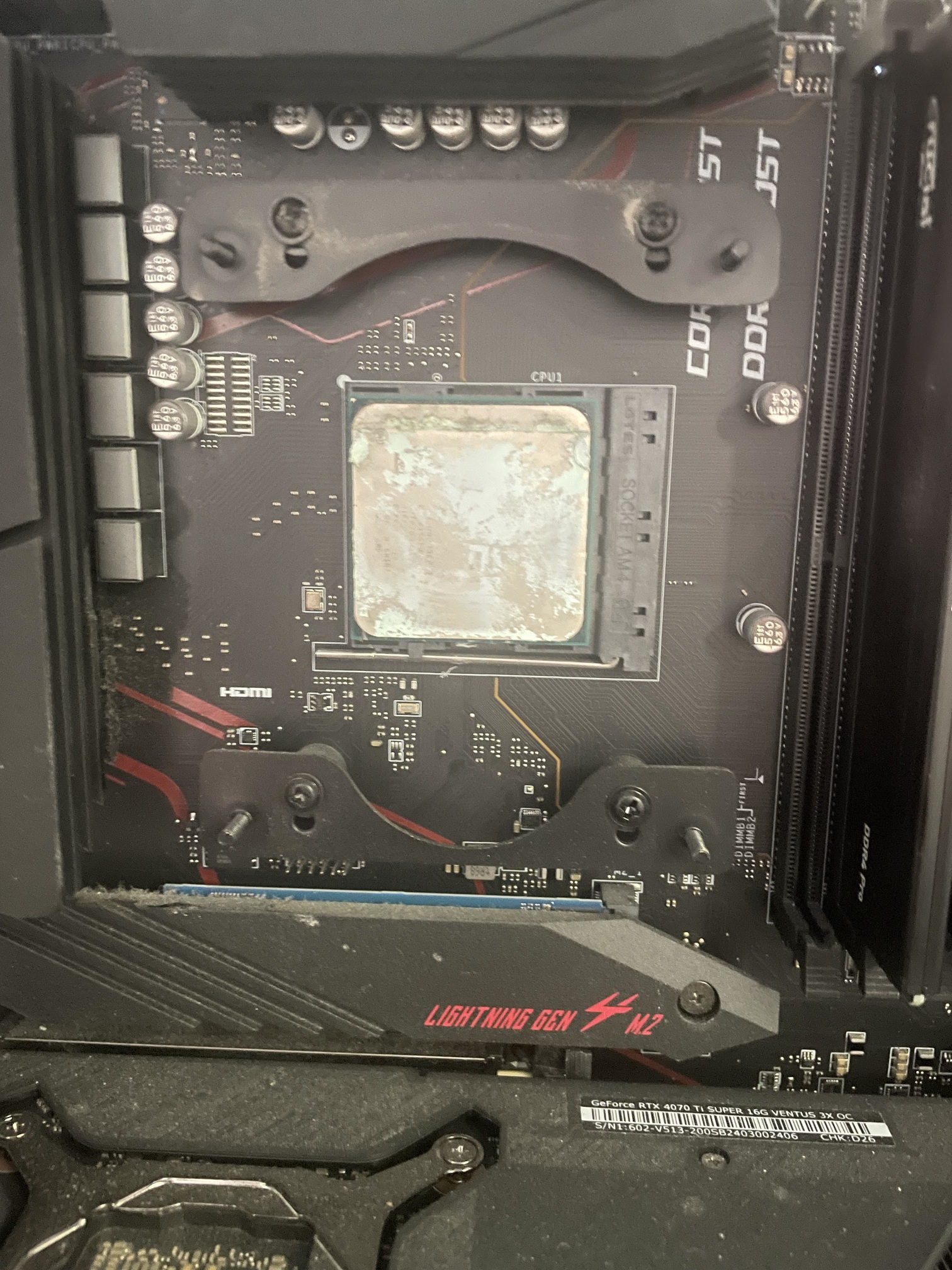Putting the thing together on the bench (with the case lying on its back like everything is one of those old IBM ATs or like a modern mini-PC that sits flat on the desk), I try to find a configuration where the cooler will physically fit around the motherboard heatsinks without making the RAM impossible to use. I find an orientation that looks good, and fit the cooler. Get the PC up and running, start Linpack, instant 100 deg C temps and throttling!
