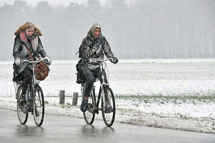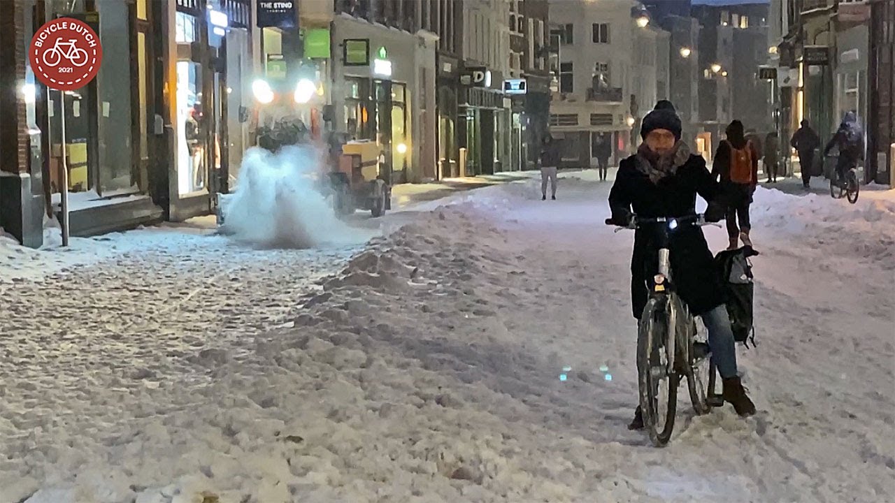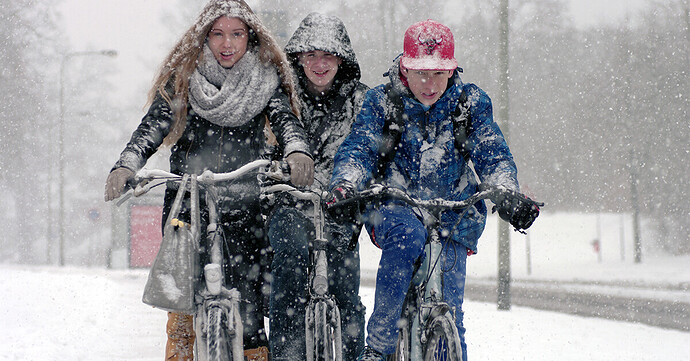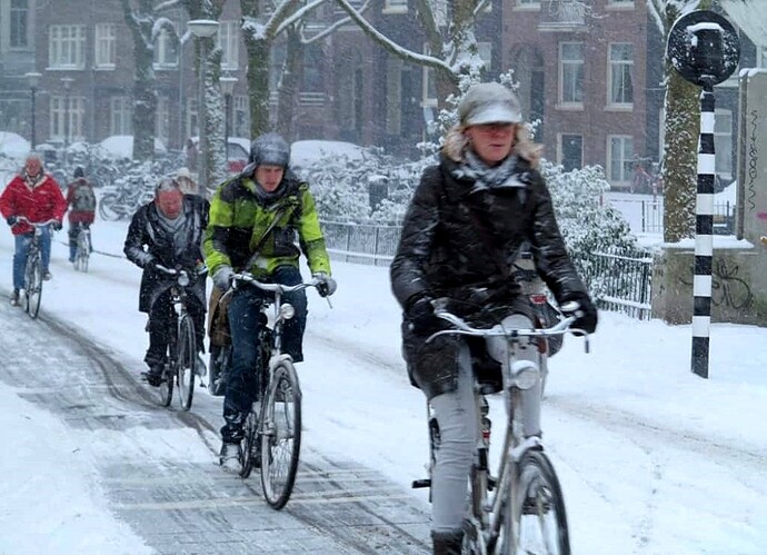 @Scoop. For those few days a year with this kind of weather conditions, it’s not worth changing the tires. (And chain guards are common.) About gritting cycle lanes and streets, see the short vid below.