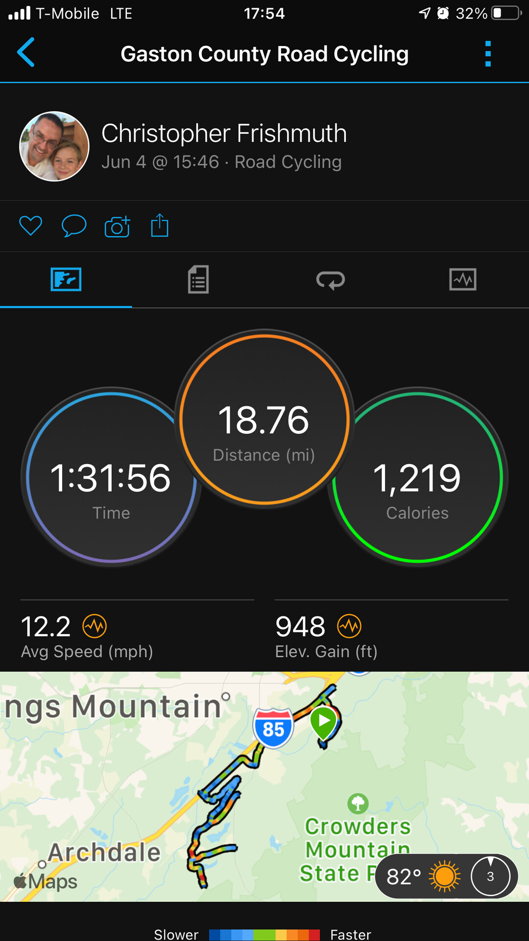 I forgot how hot 85F feels on the road. I need to hit the roads in the morning…ugh… Good news was, I felt a smidge better today…in that I stayed in the big ring for at least most of the first half of the ride. I swallowed my pride and did not do a really hilly section that adds another mile and 300 more feet of climbing. I feel slow though. Whew. Gonna be some time before I get back to where I was…