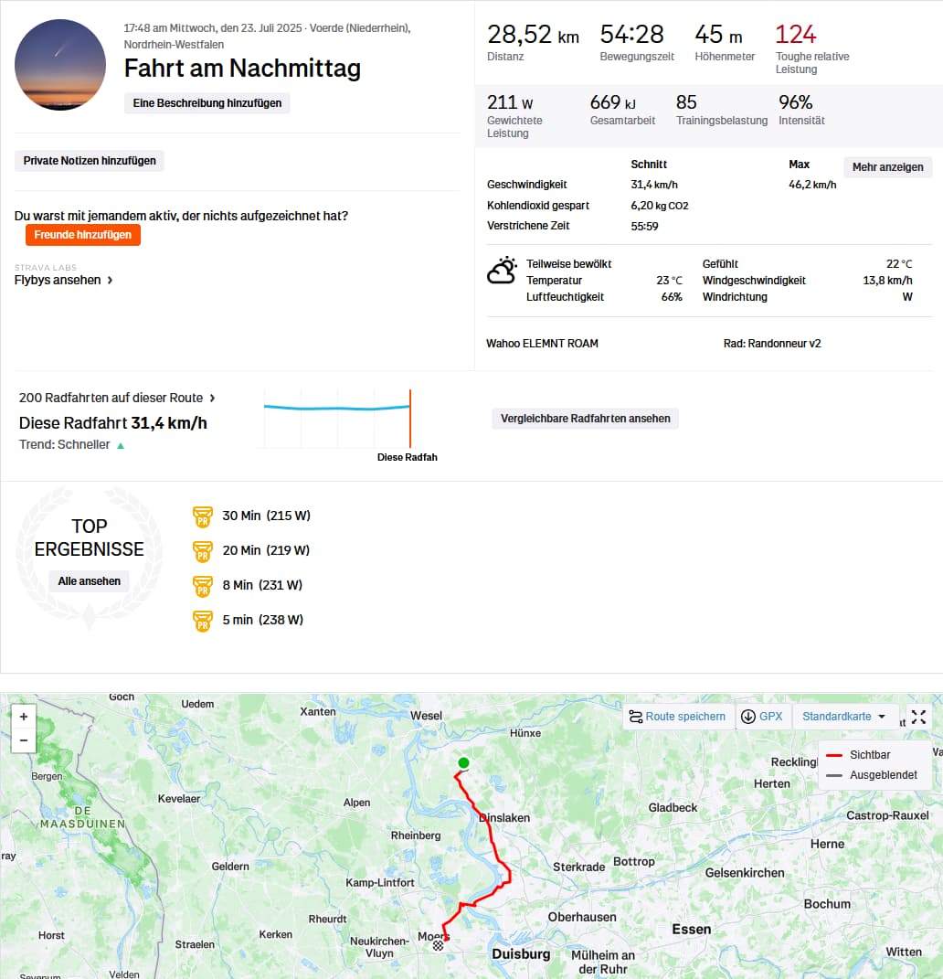 I went pretty hard this afternoon although I’ll have to do a proper FTP test when I’m fully rested. Doing it after a 9h work day with way too little sleep the previous night is probably not a good measure. Still, ~3.85W/kg is pretty decent I think.