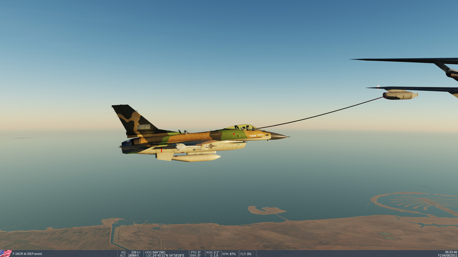 Emergency jettison stores, dump fuel, we need to drop that weight! (Does it calculate the missing wing?) We’ve made it near home, but we have to land somewhat err…fast - if I deploy the flaps (right wing) I will flip over for sure… I am flying the approach with the speedbrake out to keep my speed tamed and rudder, stick and differential thrust keep me level…ish.
