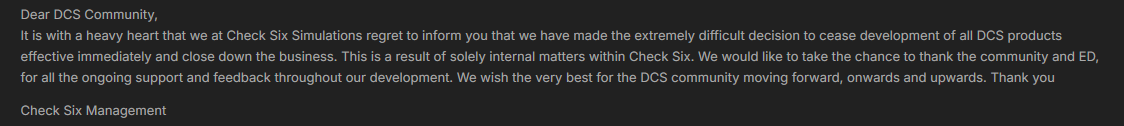 That’s sad, I was looking forward to their terrain, and a modern-ish turboprop trainer would have rounded out the “trainer-side” of DCS nicely.