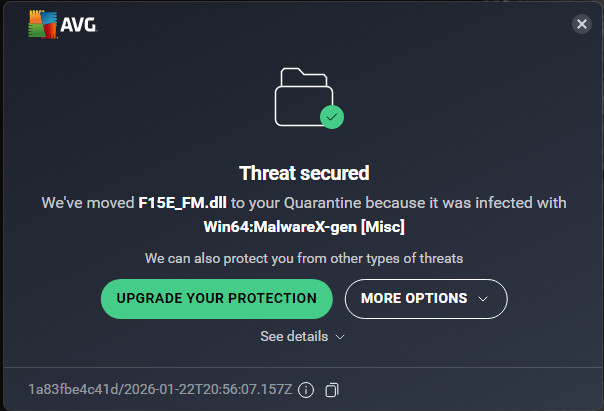 I put the whole DCS folder as exempt. I was getting the error for the F-14 and I ignored it… Then it started getting on the F-14 And F-15E… Exempted the folder… PROBLEM FIXED.