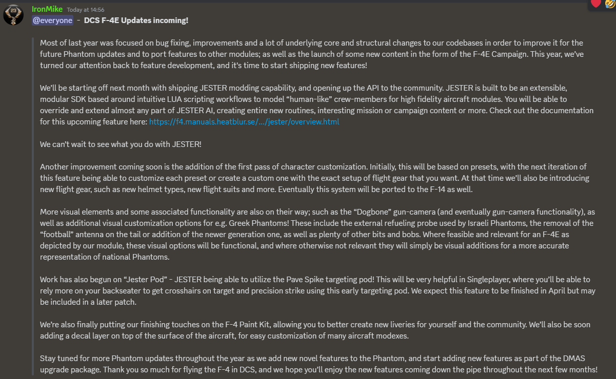 We’ll be starting off next month with shipping JESTER modding capability, and opening up the API to the community. JESTER is built to be an extensible, modular SDK based around intuitive LUA scripting workflows to model “human-like” crew-members for high fidelity aircraft modules. You will be able to override and extend almost any part of JESTER AI, creating entire new routines, interesting mission or campaign content or more. Check out the documentation for this upcoming feature here: Jester - Heatblur F-4E Phantom II