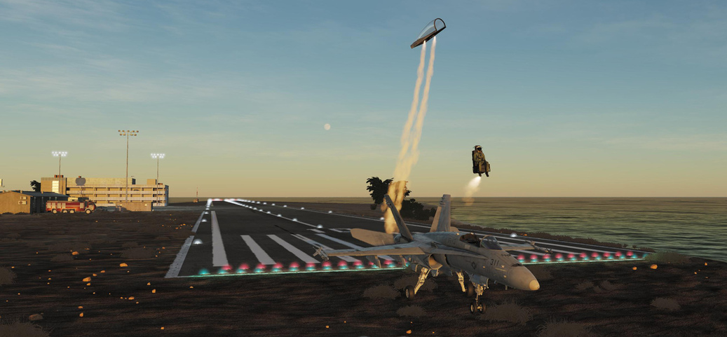 Fortunately, the jet rumbles along in the dirt and comes to rest a few hundred feet off the end of the runway…undamaged except for that whole ejection thing.