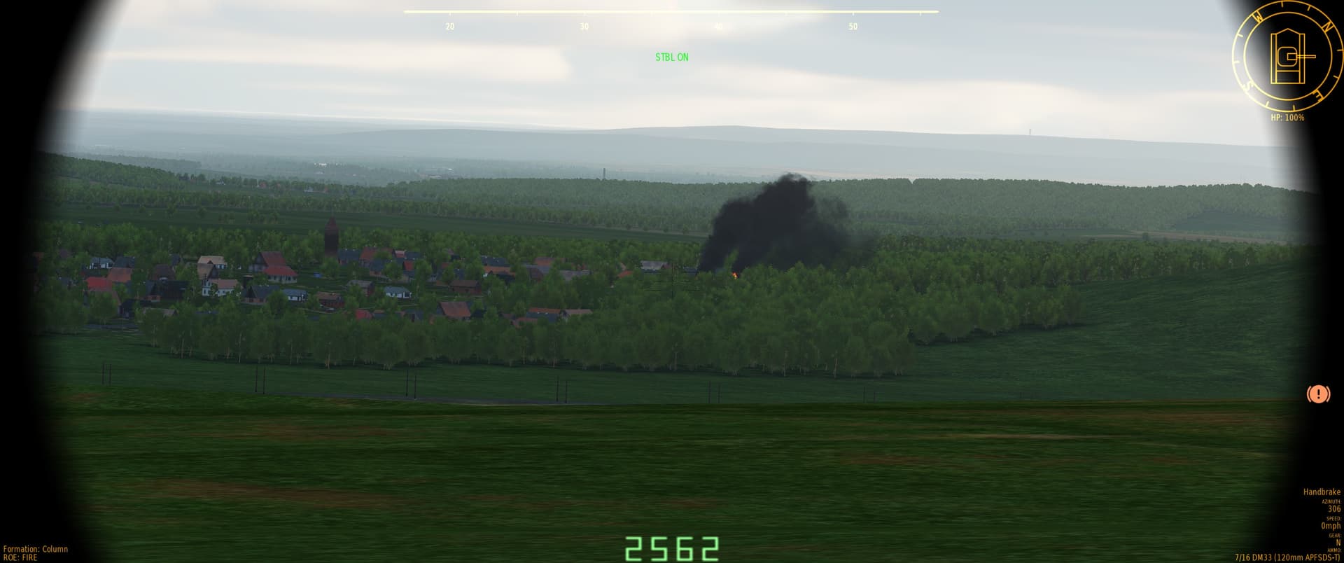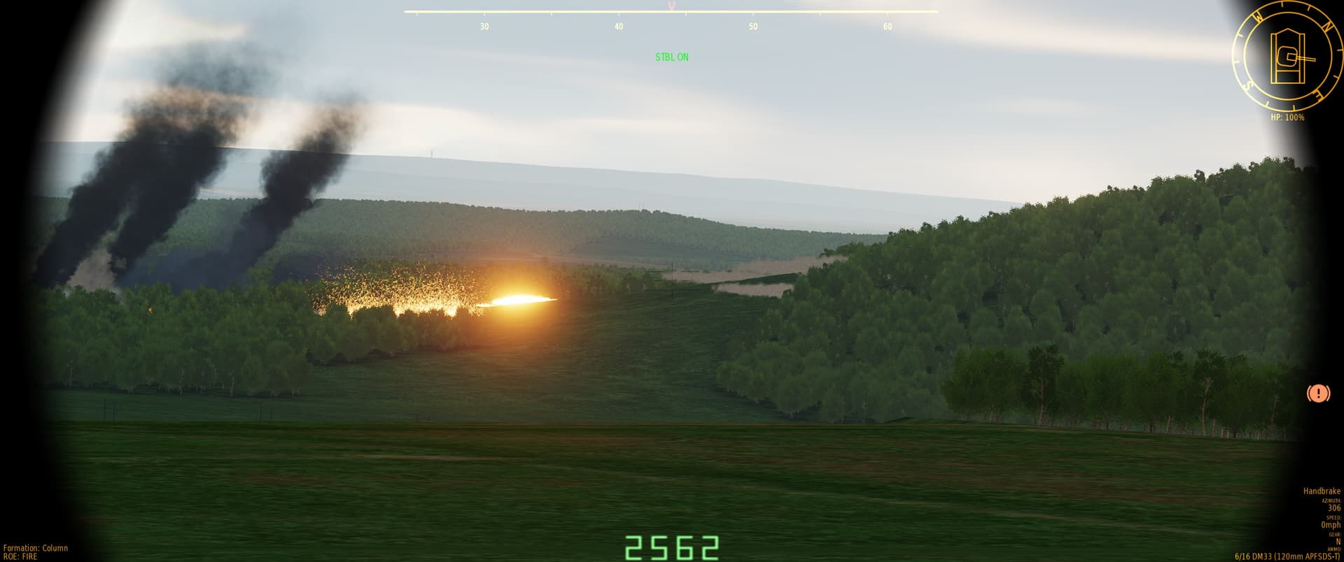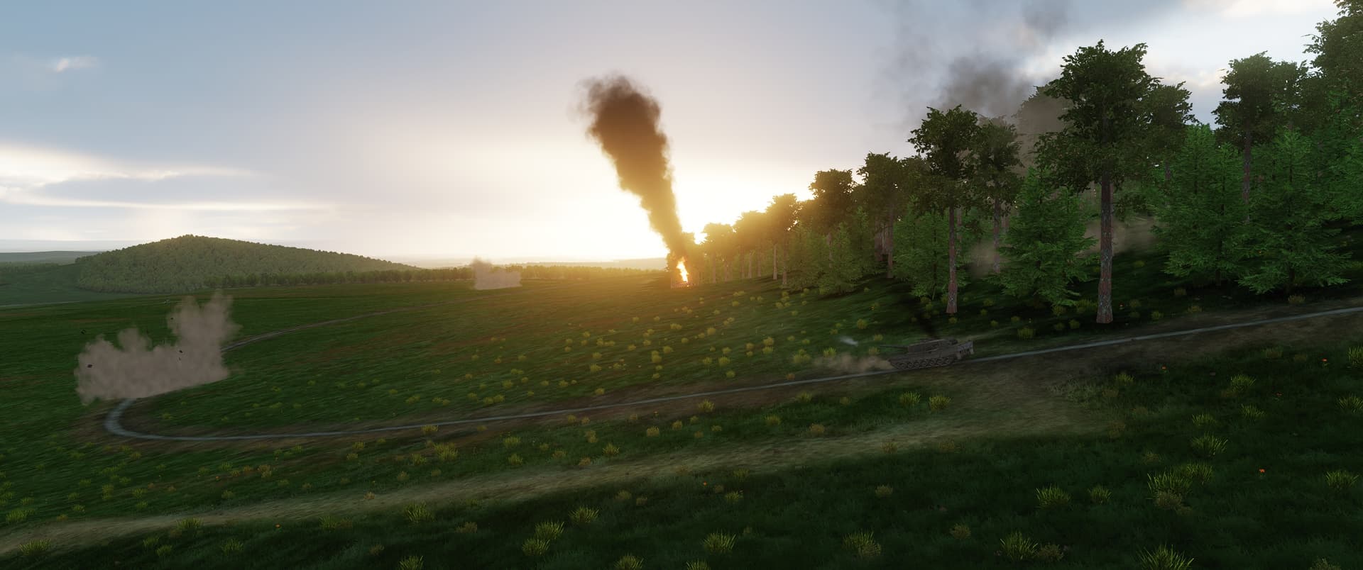 A small group of hastily assembled German Leopard tanks are watching the Soviet armor approach across the fields while the “Square Grid Removal System” puts in some work.