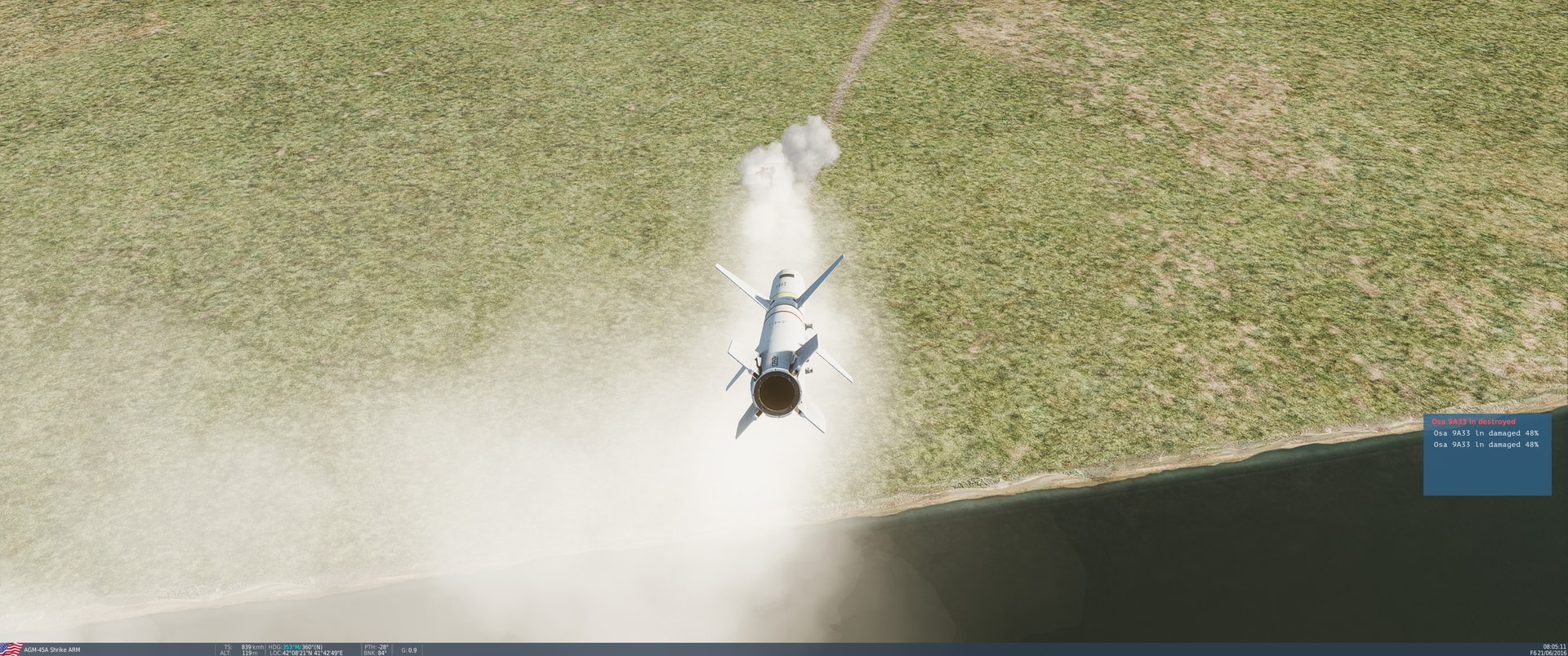 Trying a loft attack this time. From what I’ve heard this mode is getting a lot of flak for being very poor. I’m letting the Shrikes control the needles to steer me around how they want me. pretty funny as they are jittering along with the turn of the SA-8 radar and even go dead when that is looking the other way. Eventually, they grow very solid, probably because the SA-8 is looking at me angrily. I hop under the elevation needle to get the pull-up cue, hold pickle and pull!
