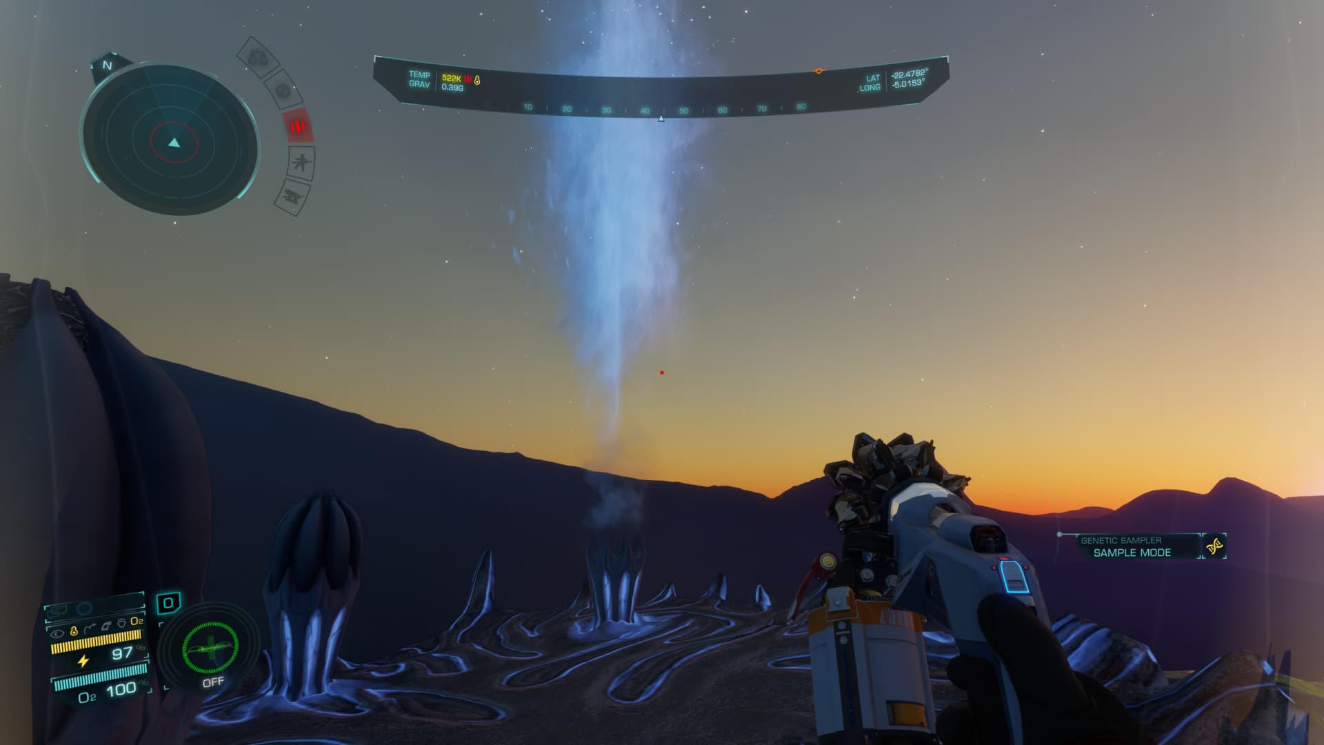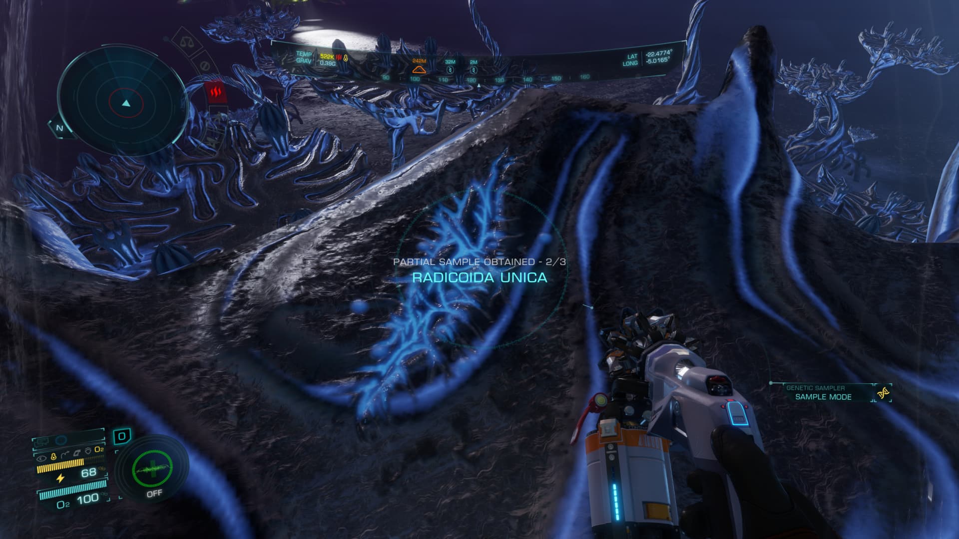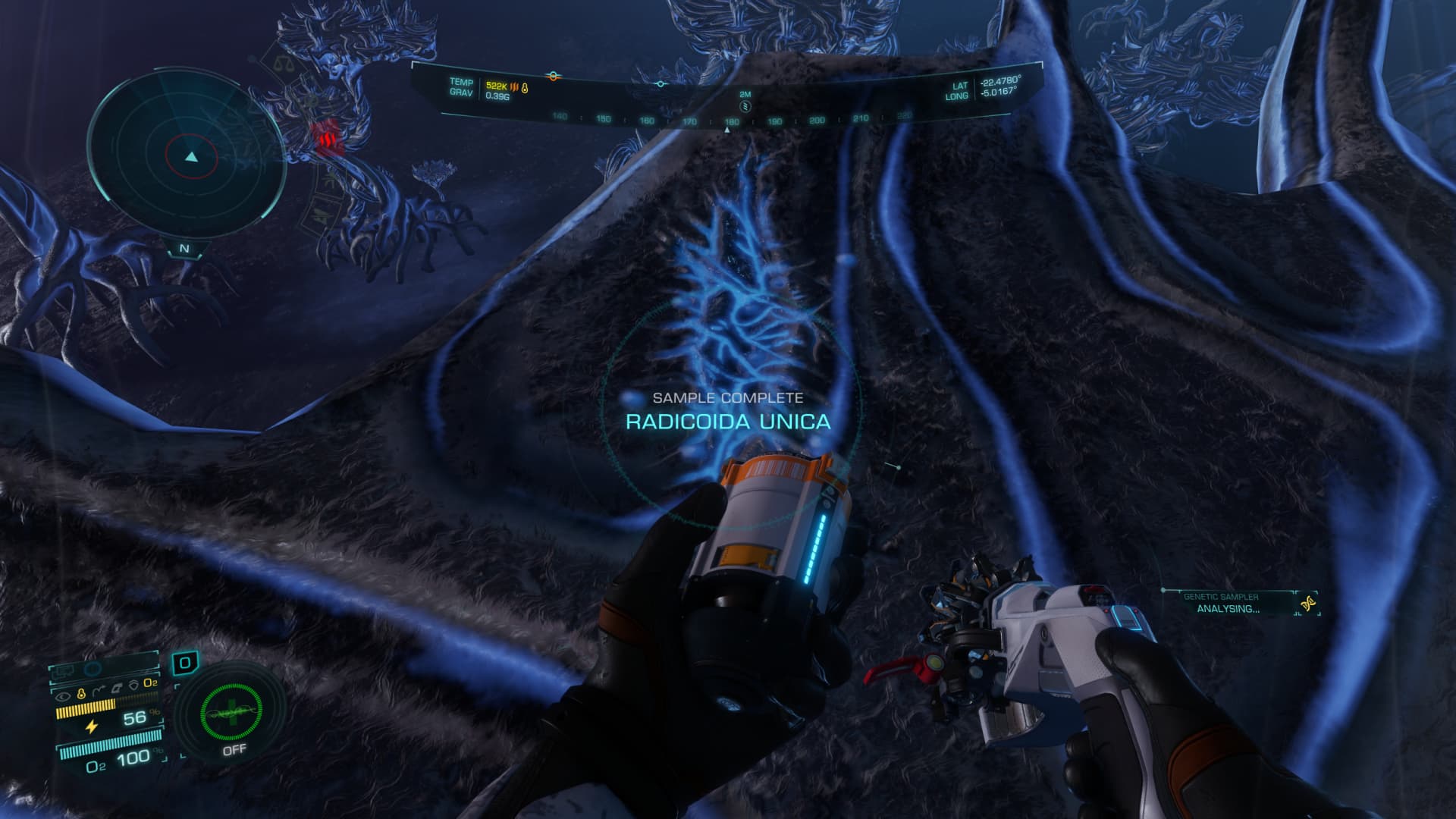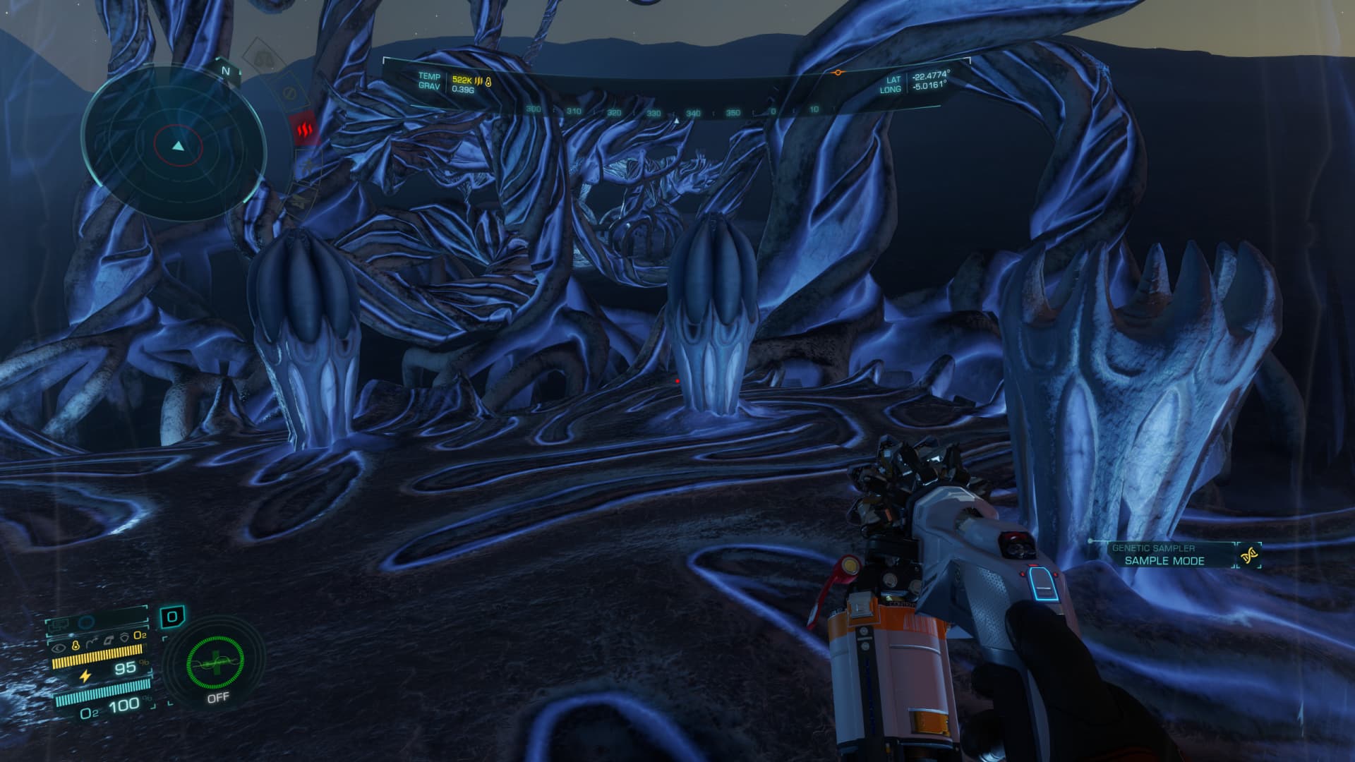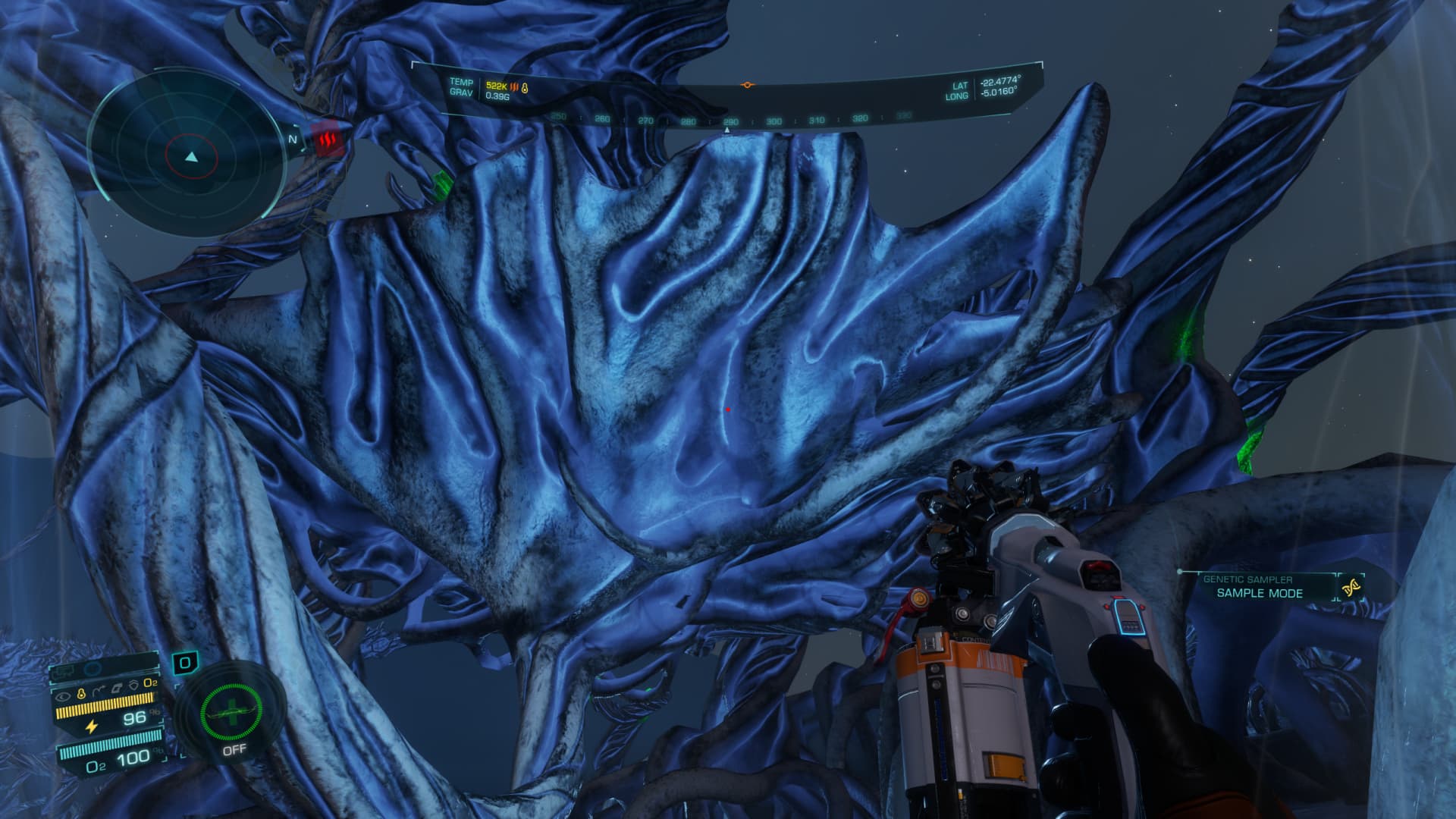 When you use the biological sampler to scout the area, some parts shine of a brilliant green… those parts can be examined and samples collected.