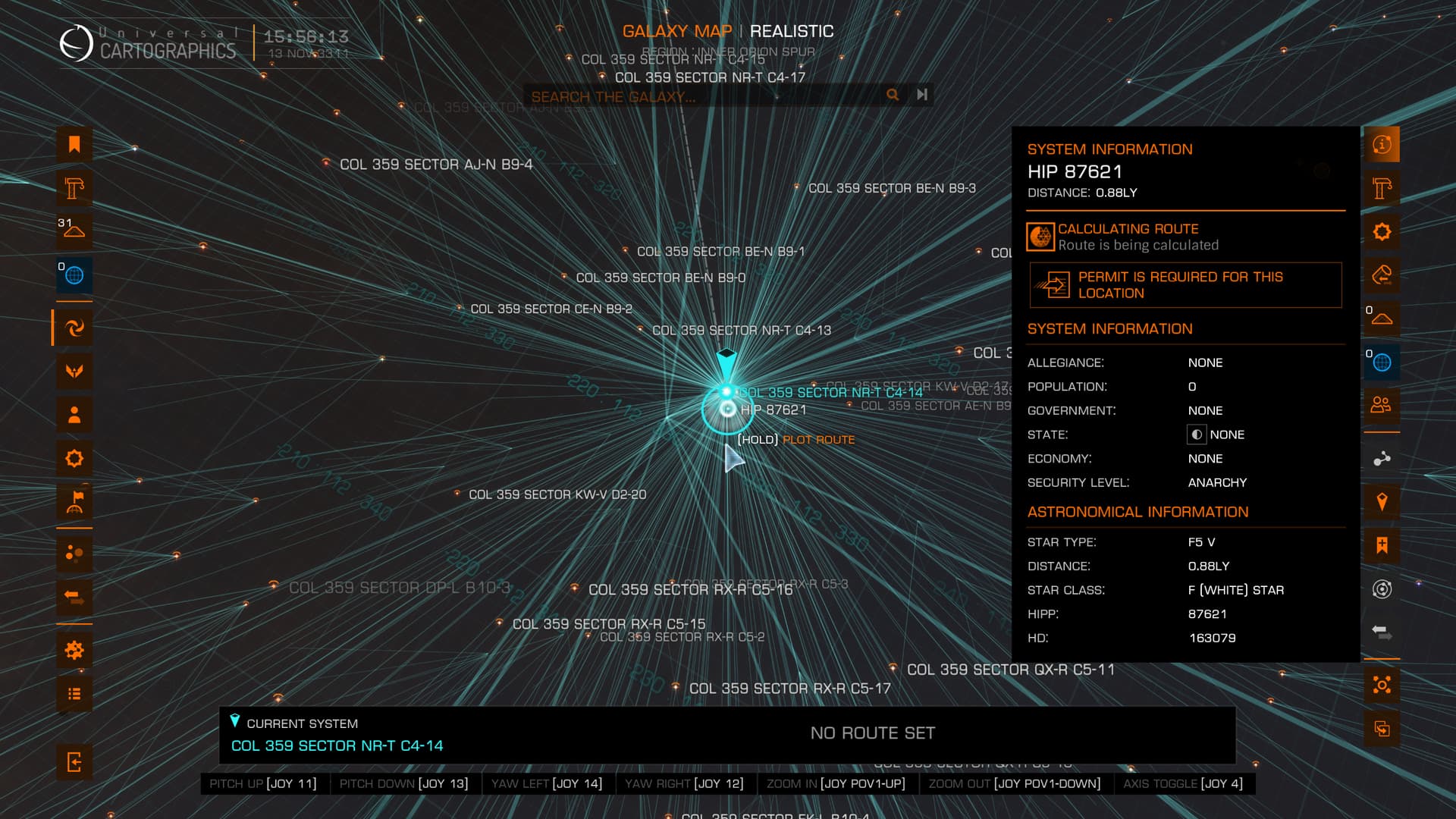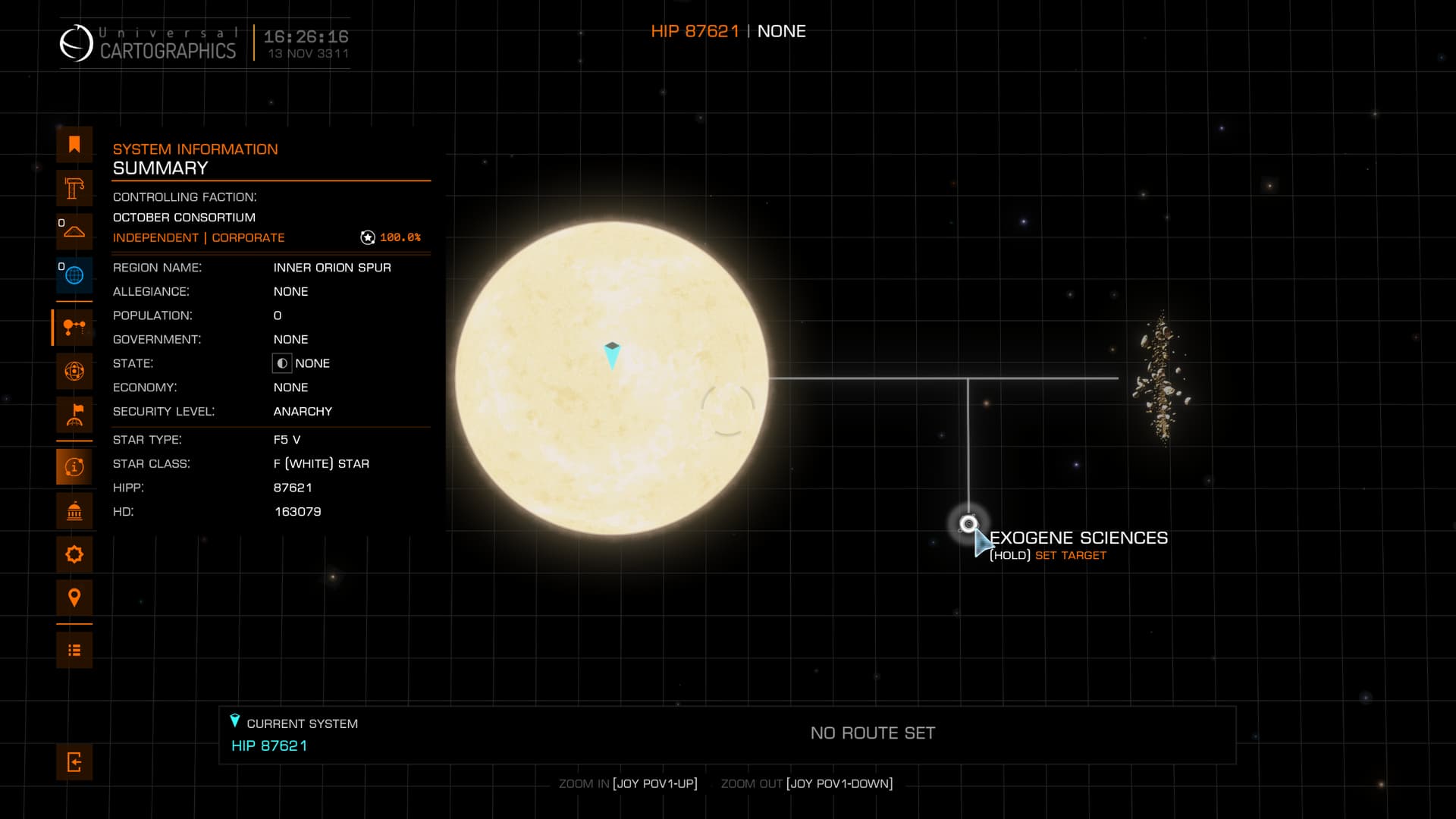 FYI: I’ve jumped Fei Lo to a star about 50 LYs from HIP 98621 just so I can have a look around there tomorrow.