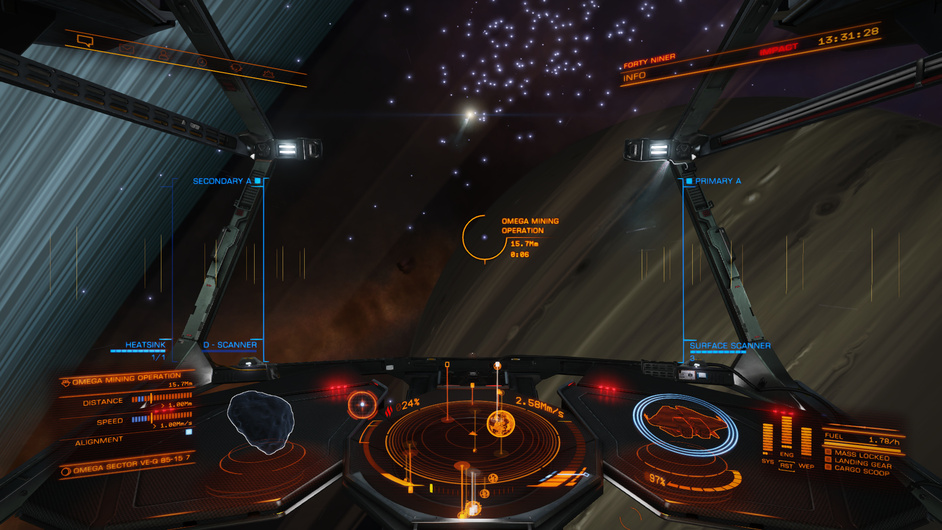 And then I arrive and cruise in to the Omega Mining Operation asteroid base. The gas giant, supercluster and local nebulae provide a stunning backdrop.