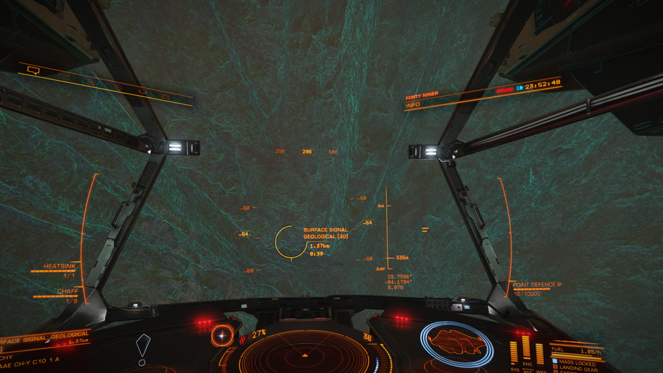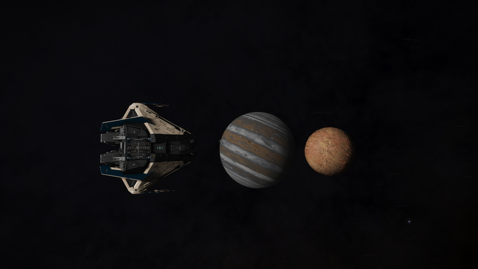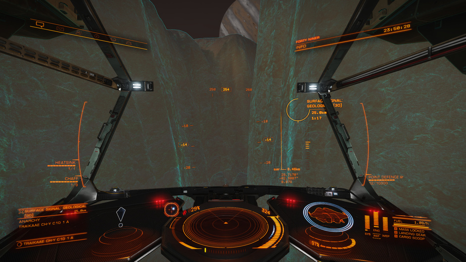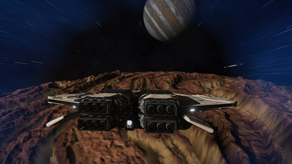 Taking off from The View is a nervous affair, but ultimately uneventful. Having never made a high g departure before I consulted the Distant Worlds Discord server for advice. The difficulty comes from the relatively large surface gravity of 3.3g. This is apparently enough to overwhelm the thrusters under normal operation. Luckily, the planetary approach suite on the ship makes provision for the aft and bottom thrusters to be overdriven in high g environments. This process is automatic but takes a while to ‘spool up’, causing problems for the Flight Assist system controlling the ship.