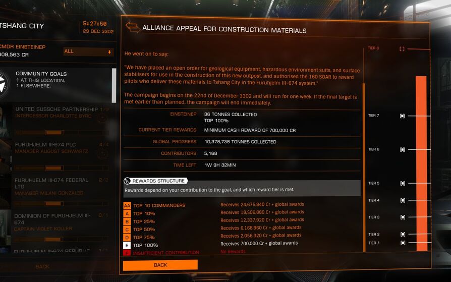 @Andrew116 talked me into trying one of the Commnity Goals - getting construction materials for the California Nebula. The real selling point was the minimum payoff of 700,000 credits. To a guy with 300K in the bank, 700,000 credits is a windfall.