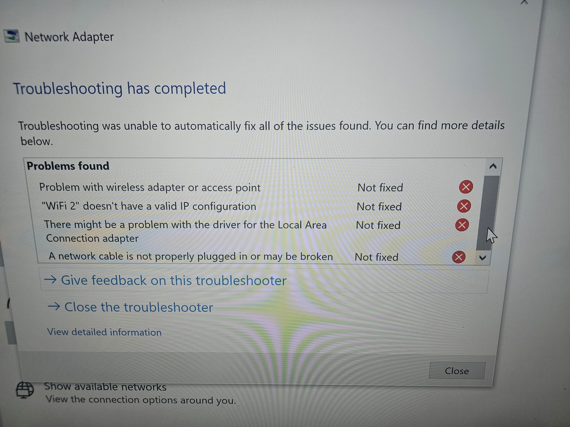 Victor, would it be to ok to ask to press the windows key and then ask for “device manager” and then check under networkadapters to see if anything is showing faulty, inadvertently turned off (it can happen sometimes if some power savings mode goes crazy) or bad drivers?