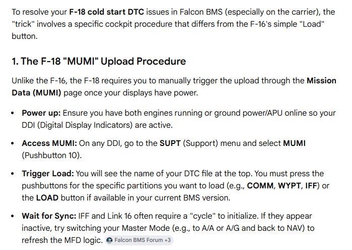 I’m on my back feet a bit on day three of my campaign. Through a lack of planes and pilots, the only way I can progress is off the carrier. The problem is that I am unable to get any DTC data to load onto a cold and dark F-18. This is especially a problem because without the upload, I get no IFF or Link16 capability. Even if I load them manually without the DTC, they don’t work. Importantly, I can just start from “Taxi” and I enter the pit in a hot jet with all the DTC stuff properly loaded. So I can fly and fight. But I really hate starting from a running jet. “RTFM” responses are fine if you point to the part of the manual that helps me help myself. And thanks!