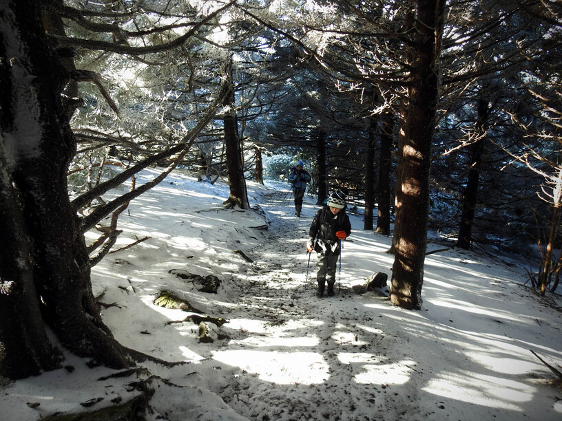 Once we dropped onto the north side of the mountain, we started descending down toward the Appalachian Trail shelter at Low Gap. The north side had been sheltered from the driving ice and the sun was actually warming the north slopes faster (that usually isn’t the case). As a result, the ice was falling from the trees in a steady tinkle and the trail was turning from frozen to muddy mush…
