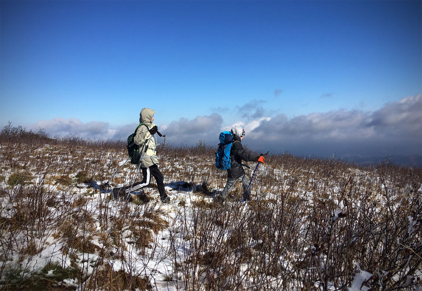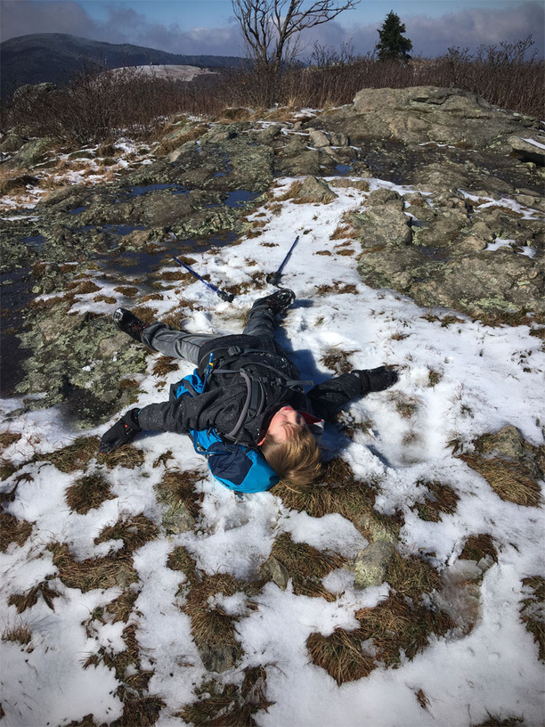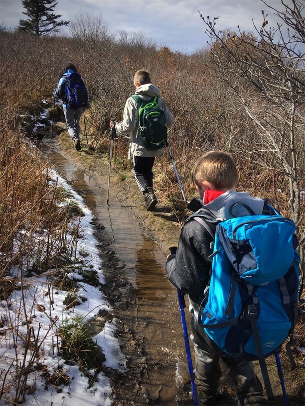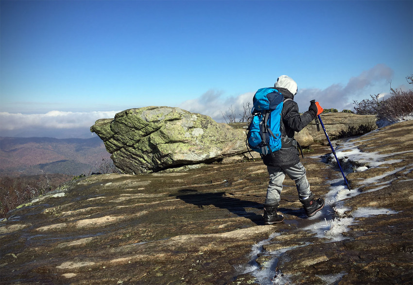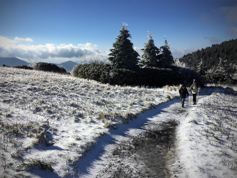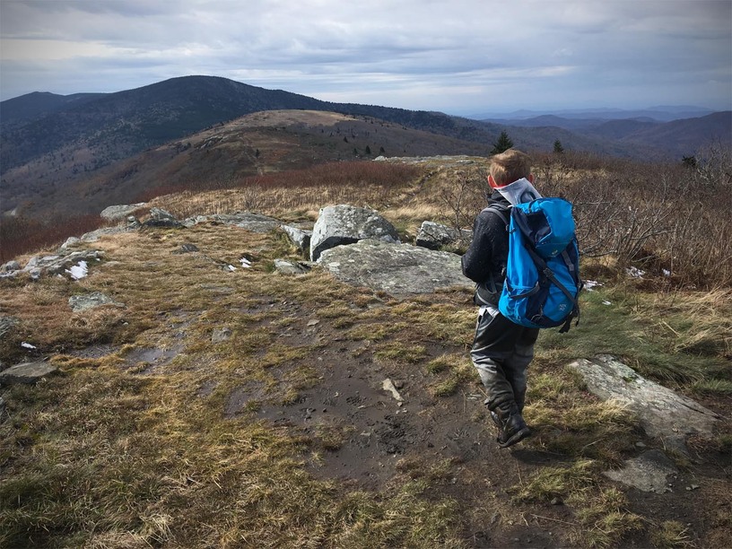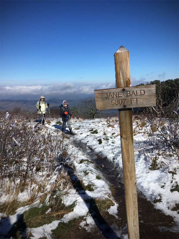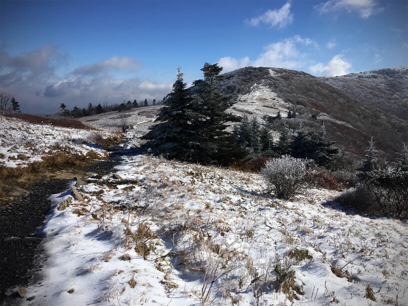 The trail leaves the treeline and heads up to the infamous “balds” that dot the southeast. Clear of trees, they are also exposed to the wind, which can tear across them…