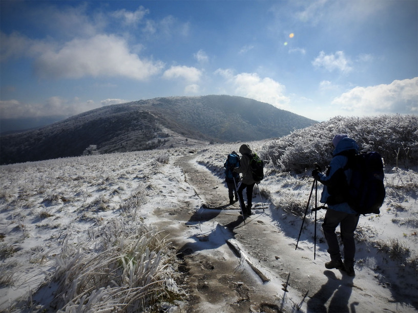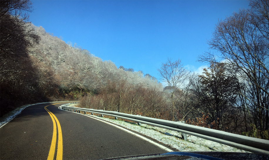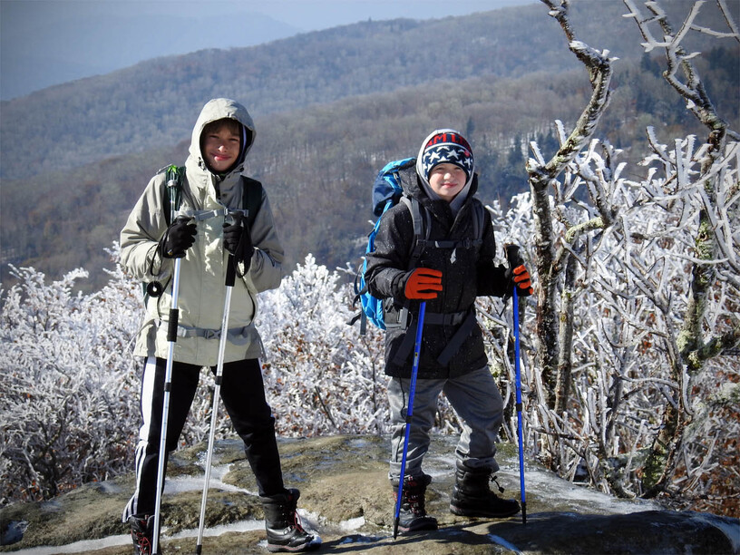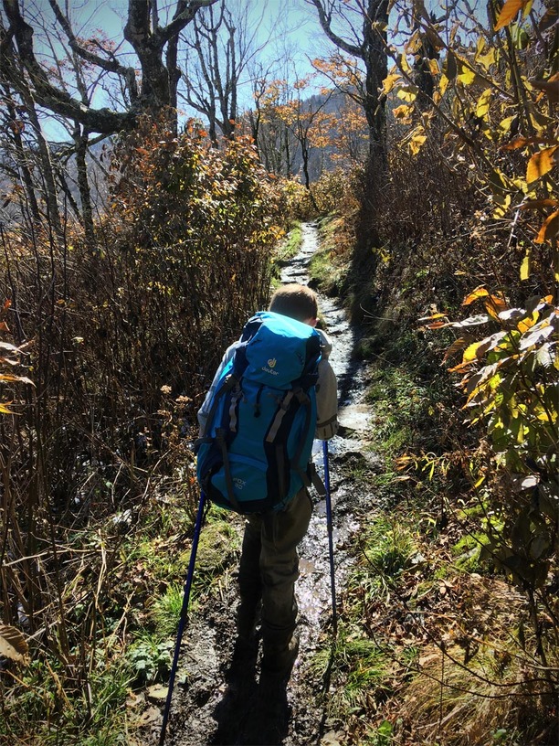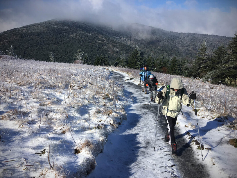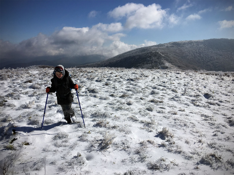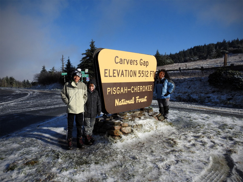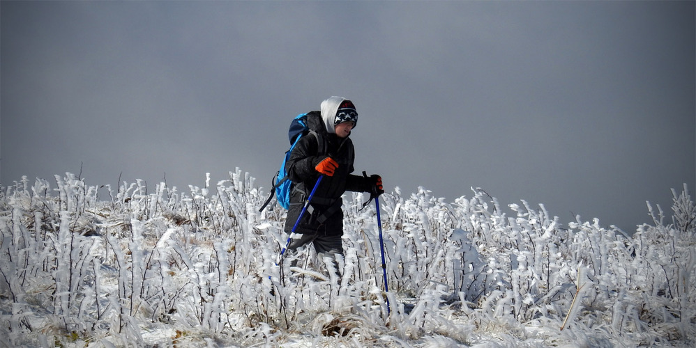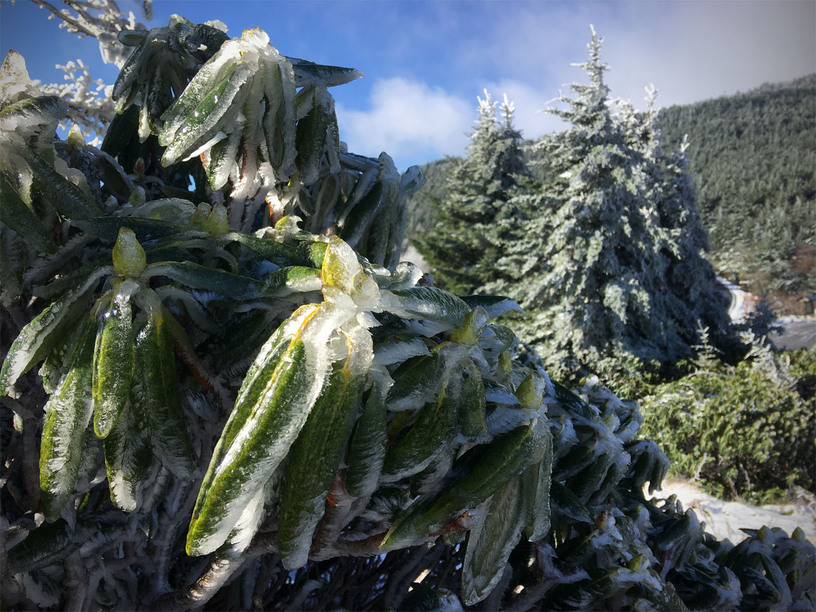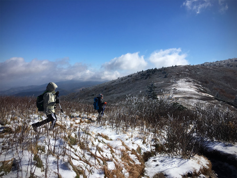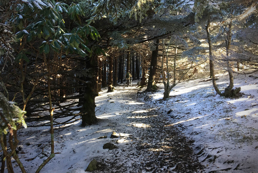 The next morning, we got up early-ish to head down the road fifteen minutes to the trailhead at Carvers Gap. The road actually climbs up to the gap and as we started out in greenery and leaves turning, we ended up hitting ice as we neared the trailhead. Everything was covered in 1/2 to an inch of rime ice with some areas also accumulating snow…