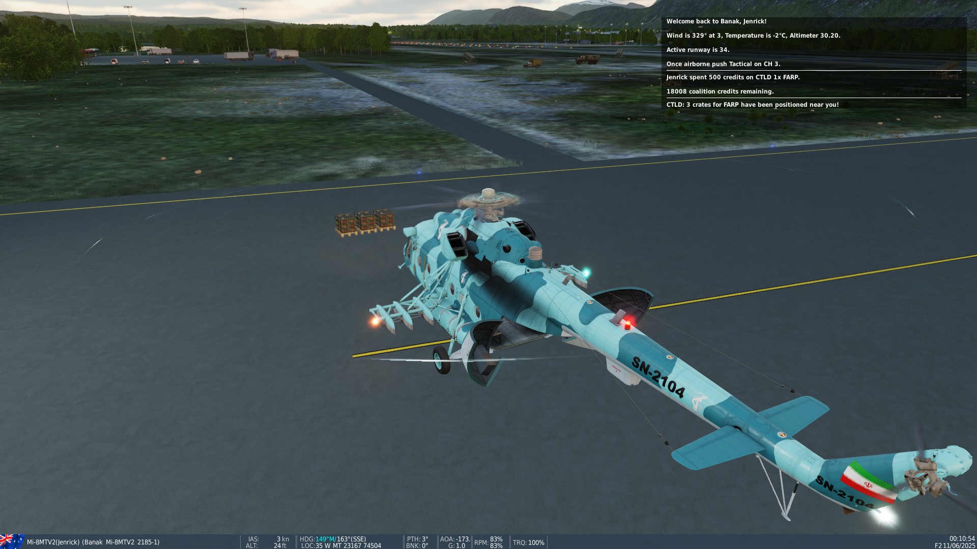 Captured sites that players can fly from all feature a munitions store referred to as the warehouse. When capturing a site, each zone cargo crate provide 30 of all munitions. How they pack 30 MK84’s and 30 AMRAAM’s etc in each crate is a mystery. After that initial load of munitions is expended, players are required to ferry new munitions to that sight to plus up the warehouse. The F10 map will let you know when a site is getting low (FARP’s don’t have an indicator, you just have to try and fly out of them to see what’s available).