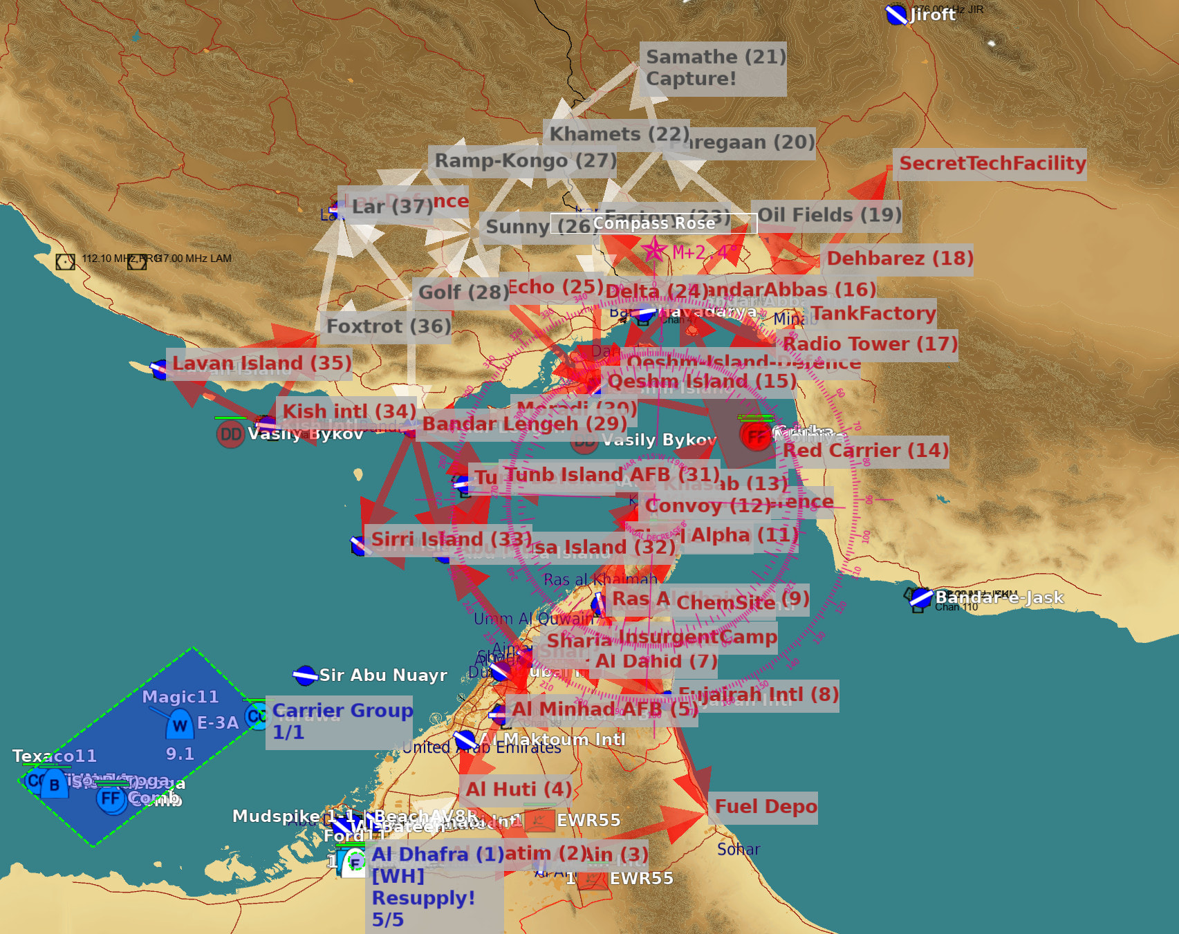 Here is the beginning state of the war. “Foothold” implies just having the barest presence on the map. It reminds me somewhat of some of the old EECH campaigns like Taiwan where you start with just a tiny piece of the island. Dynamic spawn slots are available and you can choose to start from I think the carrier, a land base, or a FARP.