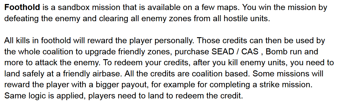 With a little bit of time to kill the past couple of weeks with poor weather dominating the Carolina area, I started poking around and discovered Leka’s Foothold dynamic mission. Apparently it is an upgrade to Dzsebkab’s original Foothold missions. I don’t know much about Foothold other than what I read on the Discord channel: