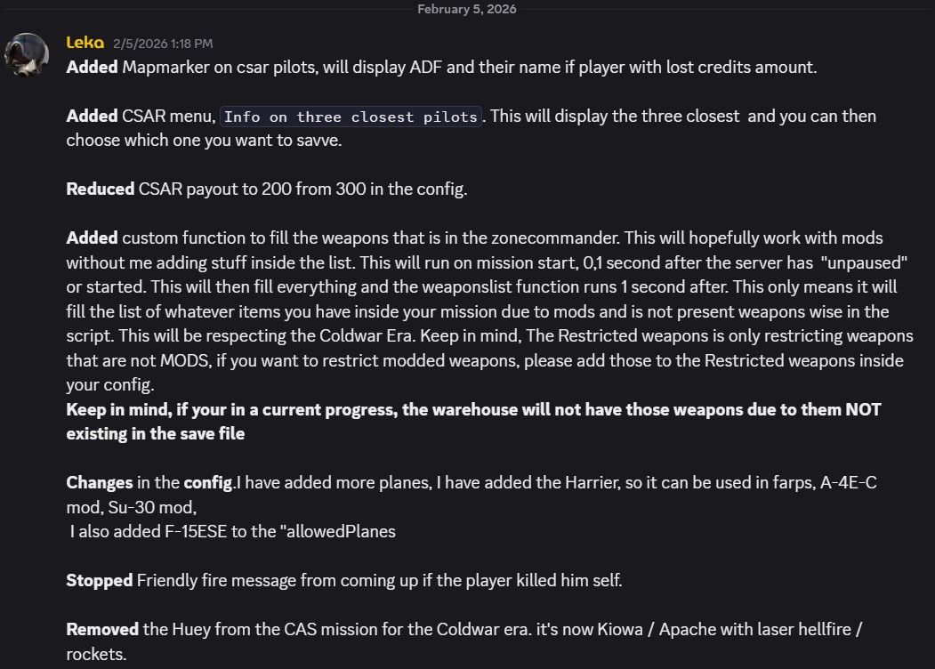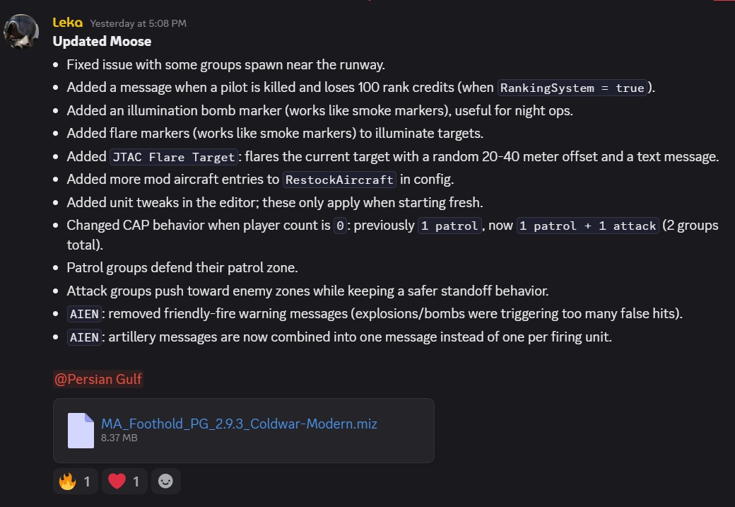 In the next day or so while the server is dormant I will update the .miz file to the most recent one Leka has tweaked. These are the lastest changes. The .miz files are retroactively compatible so the mission saves and our statistics will still work. I will be sure to back everything up just in case though…