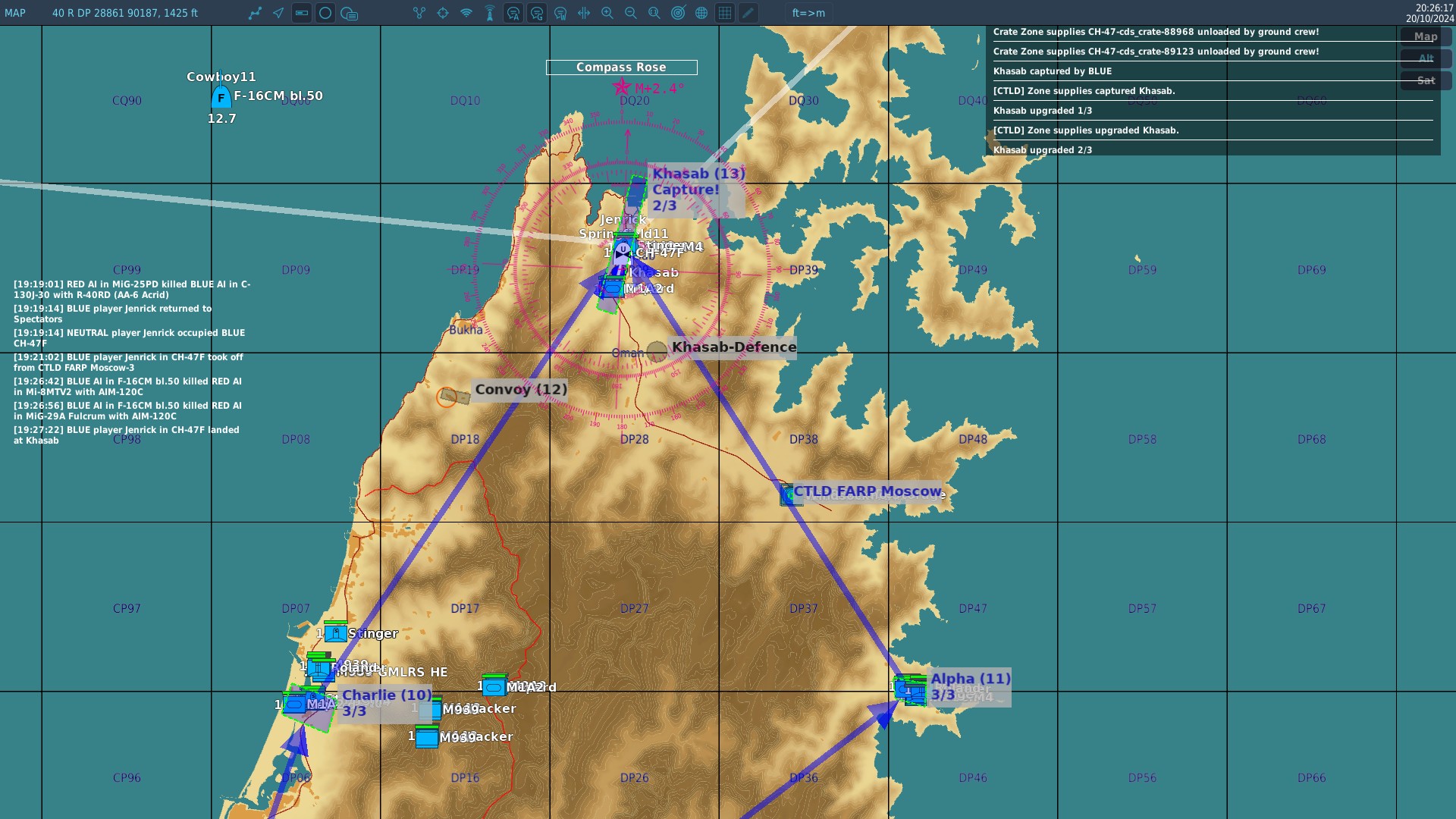 Khasab got scud’d and is down on supplies, 1/3 now. Most of the spawned ground units got blatted. Before that happened the blue base also launched some sort of cruise missile attack on the Red Carrier group (they have one!) but DCS threw them into a mountain that was inconsiderately in between Khasab and the fleet.