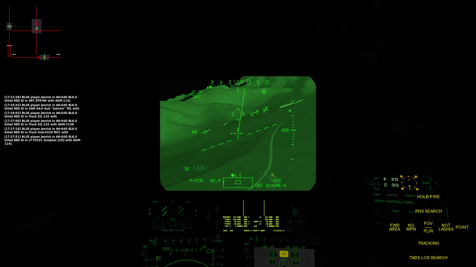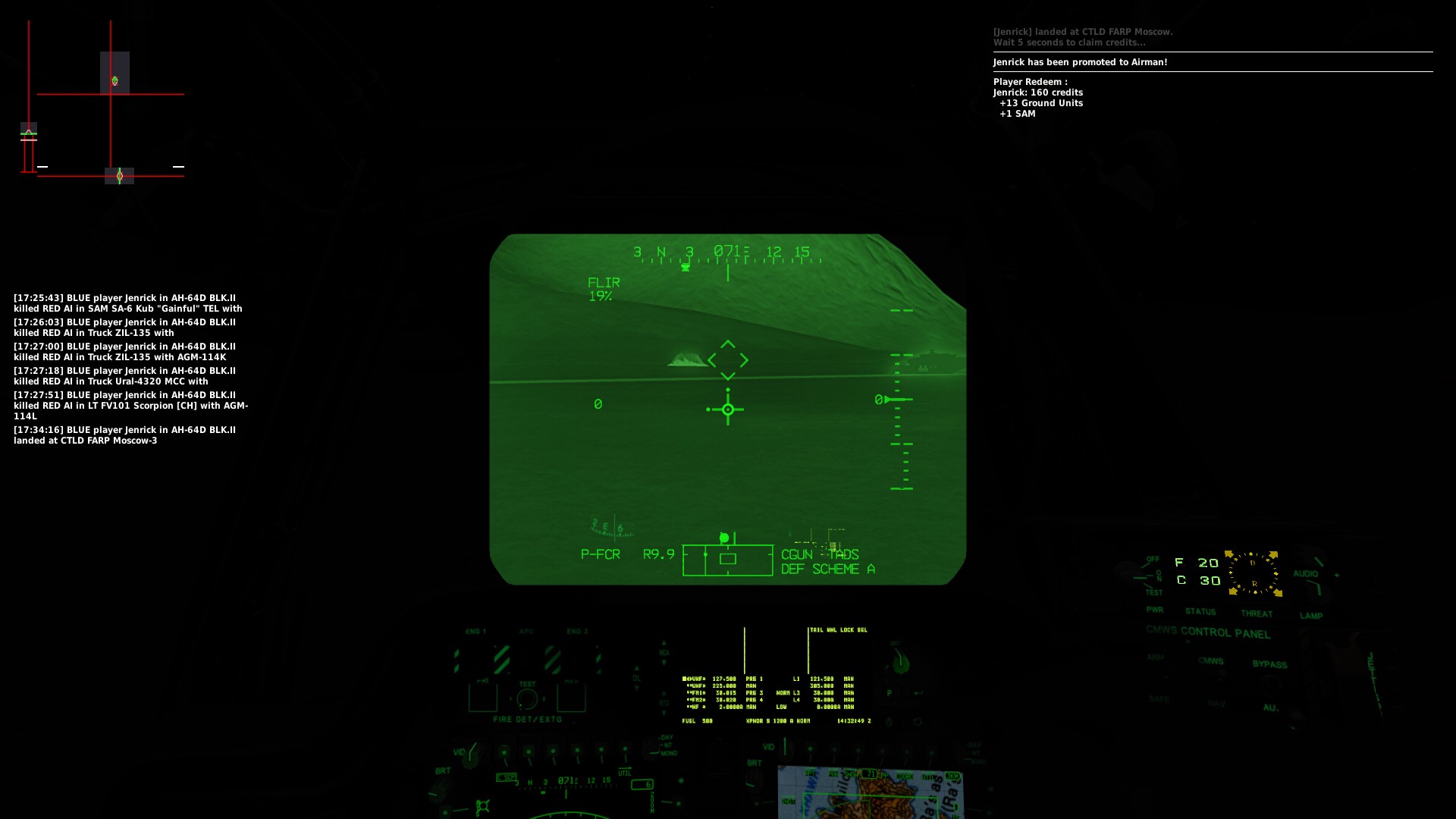 A bit of night fighting this evening, I love using the Apache in the dark. It went quite well, cleared out the Defense position, knocked down most of the SAMs and came back to reload.