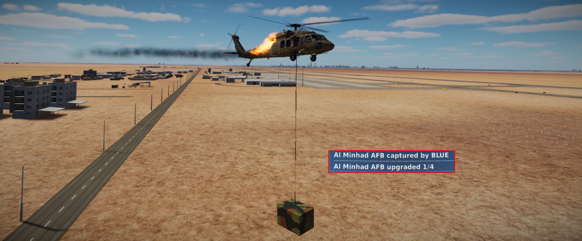 As I hunted the convoy..I was being hassled by another enemy CAP flight. Every time I turned inbound on the convoy..they would turn and chase me off. It was a very, very effective CAP that was just out of range of the BLUE ships out to the southwest. As the AI UH-60 that was enroute (slowly!) to Al-Minhad approached the base..the nearby enemy convoy must have scored some shots on him…but once again..some amazing AI flying saved the day as he landed his burning UH-60 at the base and turned it from neutral to BLUE. Yes!!!