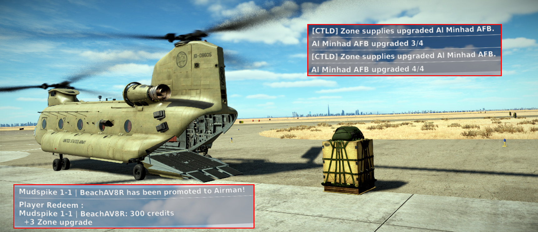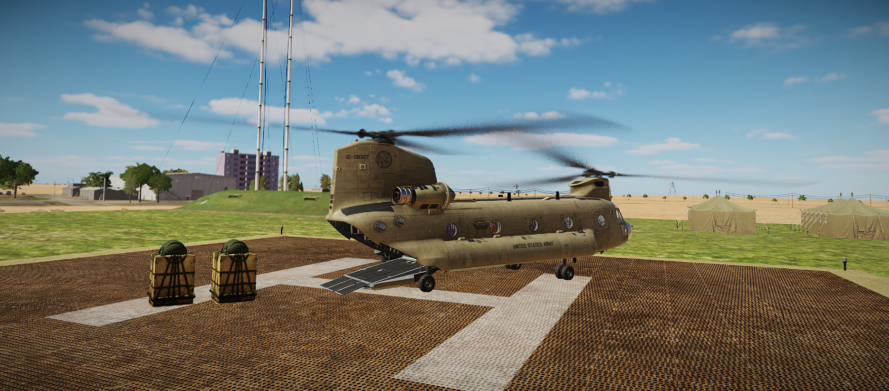 With the CAP flight preventing me from fighting the convoy..and it’s proximity to Sharjah posing a problem with longer range SAM coverage..I chose to land at the newly liberated Al Minhad so I wouldn’t lose my accumulated credits. I jumped out of the JF-17 and into a CH-47 from Al Huti..loaded up more base supplies (3 crates) and staggered into the air for the 15 minute flight from Al Huti FARP to Al Minhad..all the while hoping the enemy convoys weren’t going to be knocking on the door at Al Minhad when I got there.