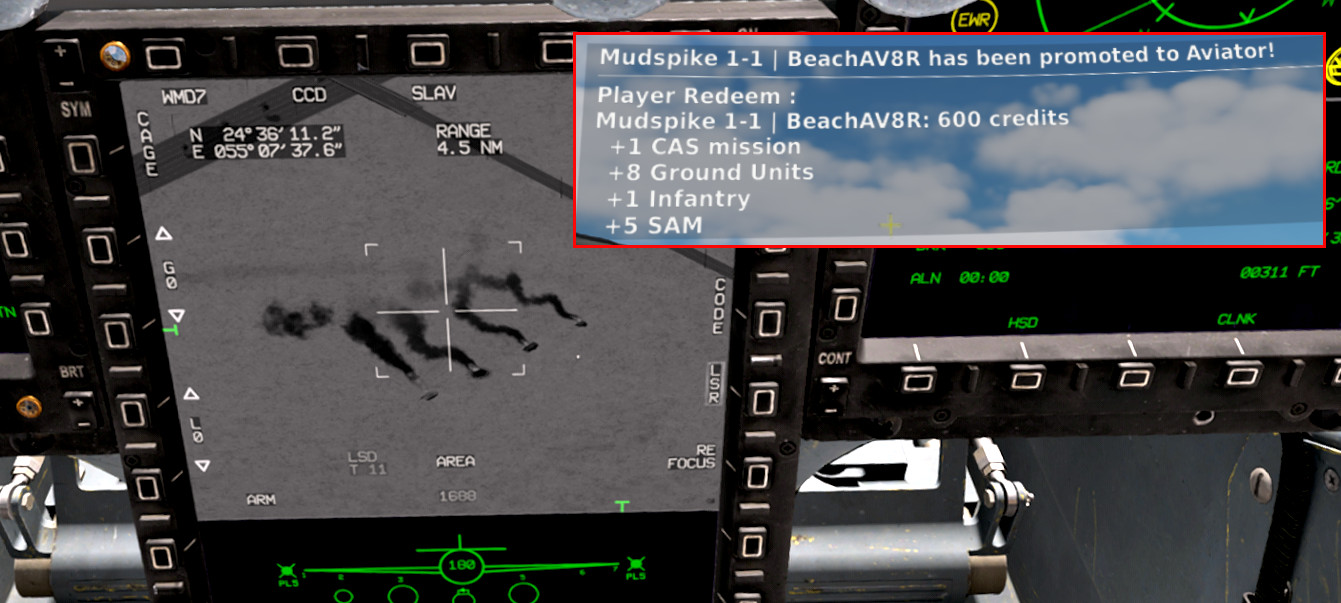 What an awesome 7 hours of flying though. I like that it isn’t easy..and I’m actually pretty amazed at the scripting of the mission that allows it to counter-attack and plan CAP flights and resupply and strike flights working together. We were simply overwhelmed. I’ll be curious to see what the situation looks like when I restart the server. As you can see..the blue side status of each base or FARP is reflected in the ratings (5/5, 3/3, 3/3)..but there is no way to know what the RED bases are currently sitting at. Obviously they will resupply if their capacity gets diminished. I believe I can expend some credits to gather intel (I think it is good for 1 hour) on Al Huti and Al Minhad and see just how much work will have to be (re)done.