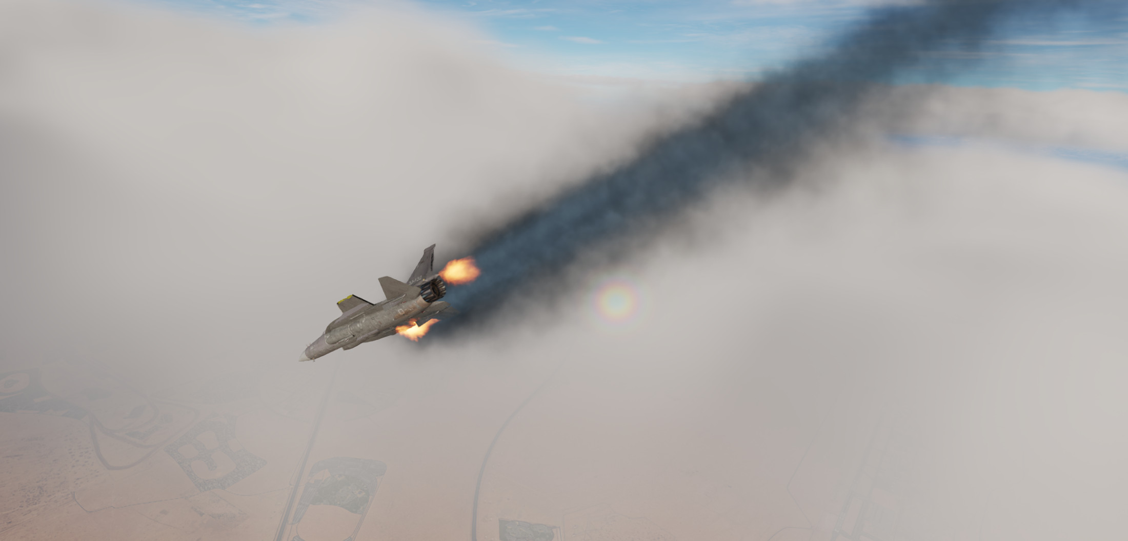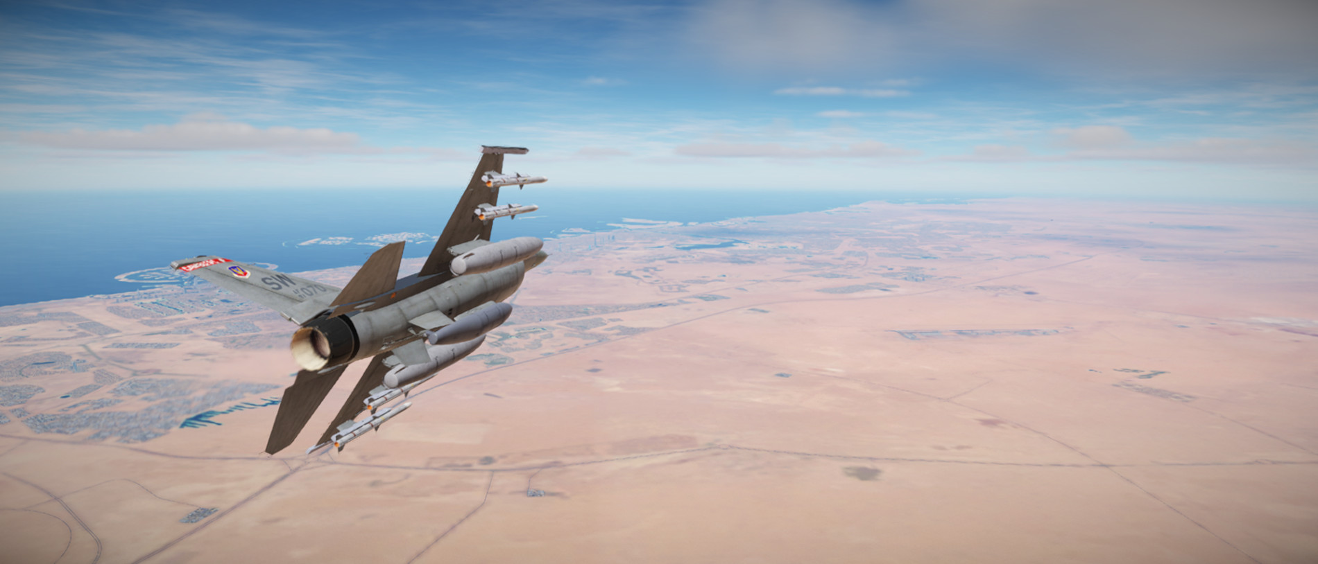 While we were plinking targets at Al Minhad..an alert came across the radio that a convoy was enroute to attack “X”. The reason I say “X” was that I didn’t have time to read the text before it went away as I was in the middle of an attack. Thus began a 45 minute search for a convoy we presumed was leaving Al Minhad for Al Huti. To our great delight, the Ground Moving Target (GMT) mode of the ground radar was able to see the convoy (sometimes). In the JF-17, targeting with the GMT radar then slews the targeting pod onto the locked target..super convenient for laser rockets. Unfortunately, during one of my passes trying to locate the convoy I got too low and a SA-something that was embedded in the convoy shot me down. Dumb, dumb, dumb.