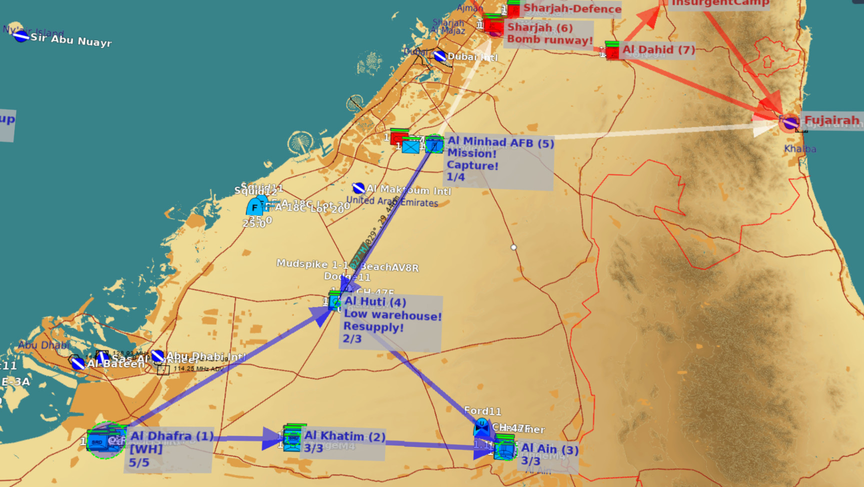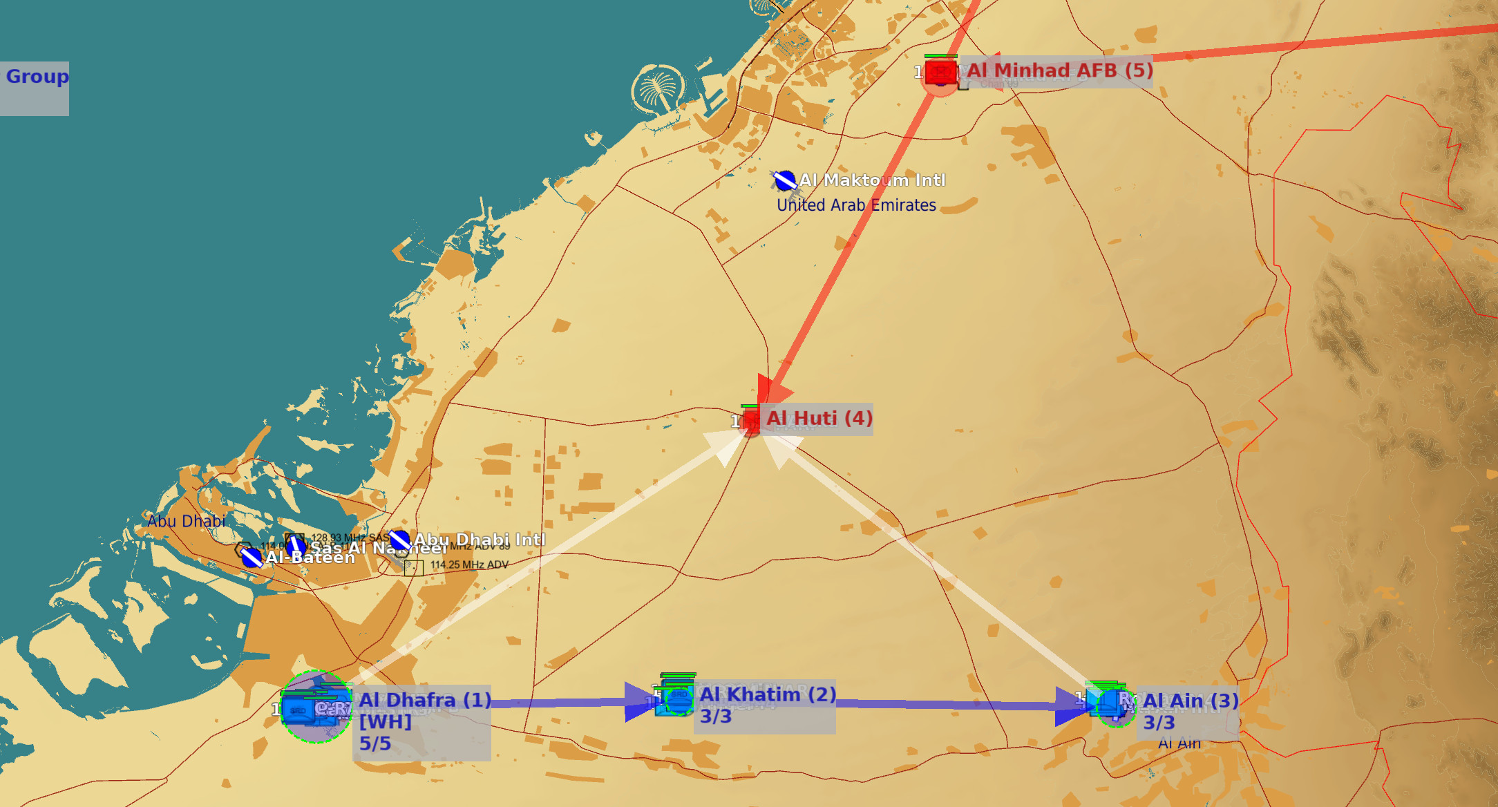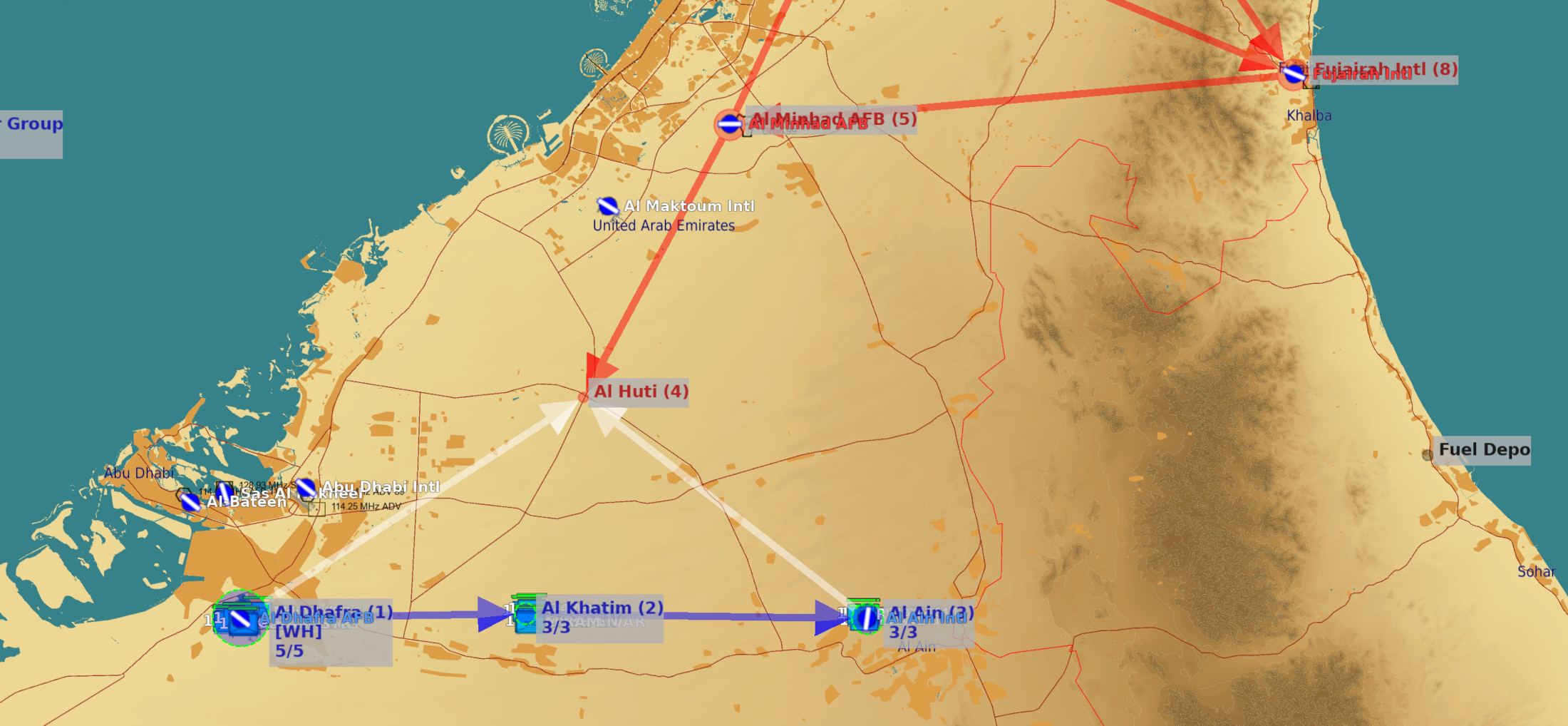 But the CAP did turn hot and handled the situation. I was frantic because I also saw an IL-76 had departed Sharjah and was enroute to further reinforce Al Minhad. I figured if a big cargo helicopter could bring a friendly FARP from a “1” status to a “3” status that something as big as an IL-76 would certainly totally reconstitute Al Minhad. This was a problem. I breathed a sigh of relief though when I saw the F-16 CAP engage the IL-76…