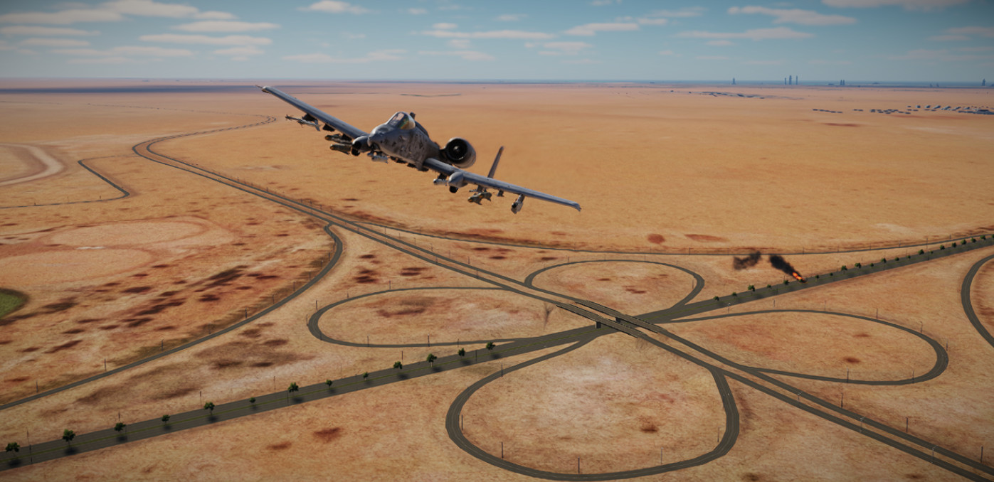 Meanwhile..my back-and-forth engagement with convoy has been going frustratingly bad and I’m finally down to just once vehicle left..a T-80. I’m out of weapons and he is approaching the airfield. I don’t really have time to land and rearm and reinitialize the JF-17 systems..so I make a decision to go old, old school. I land the JF-17, release the slot, collect my credits, and hop in to the FC3 A-10A..! Of course..no controls were mapped..my rudder pedals are making the stick move..etc.. So a quick minute of mapping controls and I’m into the air in this strange yet familiar beast… I only need the one important weapon on the A-10.. BRRRRRRTTTT..and it’s done.