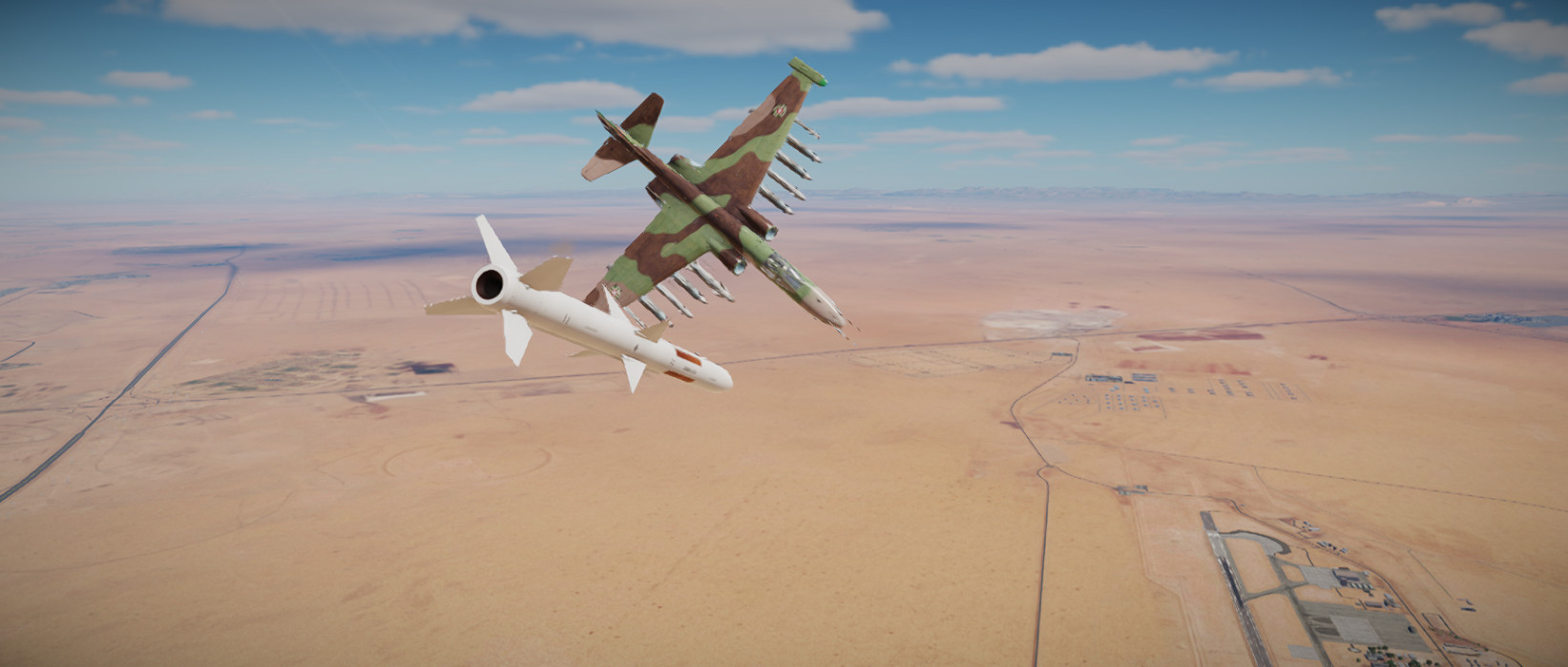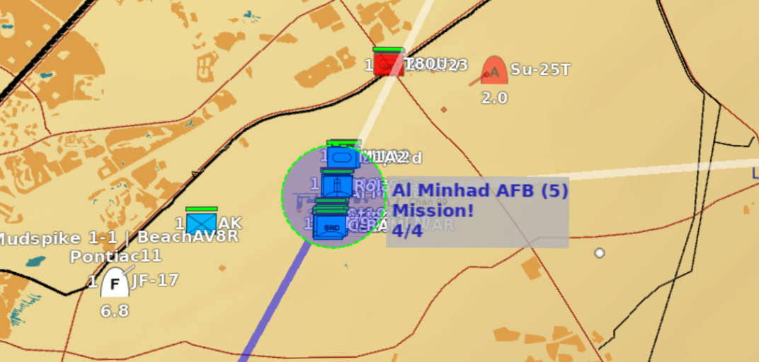 Oh God..it never stops. As I’m searching for the convoy..which is now dangerously close to Al Minhad..another flight of Su-25Ts comes in and starts counter-attacking Al-Minhad with air-to-ground missiles. The close-in anti-air at the base actually manages to shoot them down after taking just a little damage.