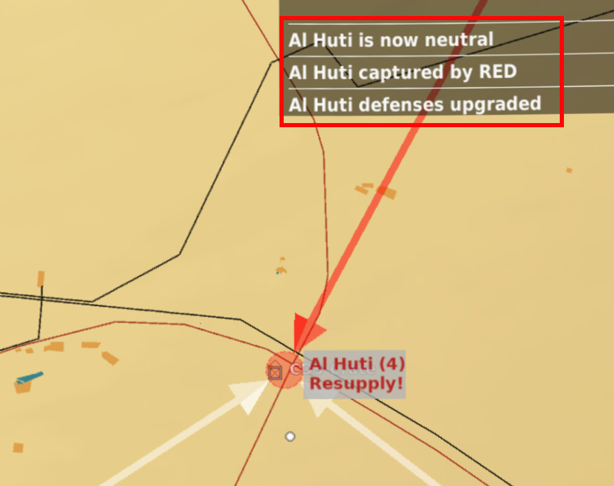 At this point, in retrospect, I should have abandoned Al Minhad and proceeded directly to Al Huti and taken care of business there. I thought I would have time to do that.. Uh..no..that attack did not last long. I received the message at 0109 and the attack ended with the capture of Al Huti at 0116 - six minutes would probably not have mattered unless someone competent had spawned in at the FARP in a hot attack helicopter.