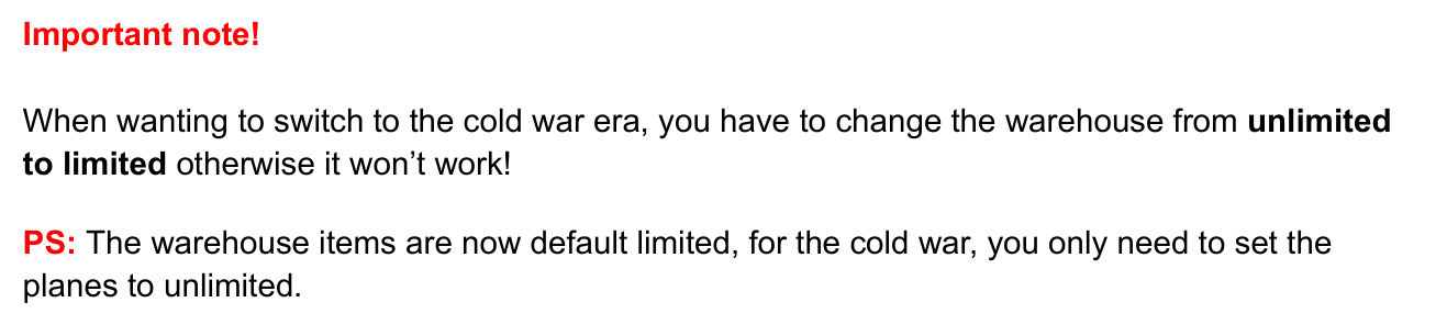 (4)(a) A helo transporting crates to setup a FARP may NOT carry additional cargo crates for the FARP, except as a sling load. Right now a CH-47 can carry a FARP and 4 cargo crates all internally, all at once. This will help tighten the logistics aspect unless players work together to plus up the FARP from the get go, while still giving the CH-47 the capability to carry more cargo (just not game breakingly so). I’ll have to see what the C-130 can carry to see what if any limitations it might need for balancing. Right now I’d say if you can get it in the Herc you can bring it.