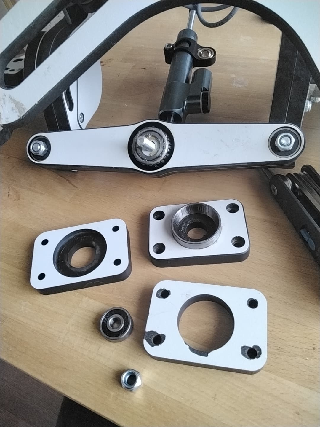 The front hinge is a stack of three bits of plastic with identical outer dimensions, but different holes in each of them. One contains a ring of metal that fits the bearing on the moving part. So that is the top one. But now I have three bits (two plastic plates and a bearing) that I can’t figure out how they belong!